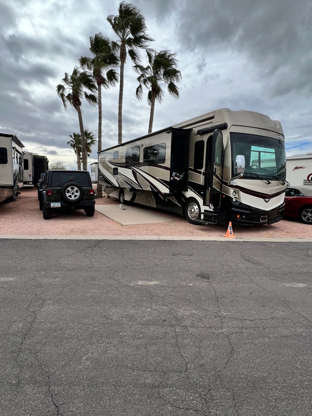 After visiting 34 states and 11,000 miles last year, obviously the motorhome needed service before we embarked on our new travels. I scheduled the maintenance at Velocity Truck Center (Freightliner) and made sure they understood that we are full-timers and need the motorhome back the same day. We arrived at 7am on the scheduled day. We learned that in addition to the PM (Preventive Maintenance) there were some recalls as well. Nothing they couldn’t handle and it would be done by the end of the day. Valerie called me at 3pm as she was leaving for the day. She said it would be done and there was someone on site until 7pm for us to pick it up. We arrived at 5pm and the customer service guy said it should be done shortly. I sat in the waiting room for about 1/2 an hour when he came in and said the words you never want to hear, “I’ve got good news and bad news”. The good news was the PM was done. The bad news was that the tech had to wait for a part to be delivered the next morning to finish the recall. The tech had left for the day several hours prior without informing anyone. What to do now???!!! The customer service dude (I don’t remember his name) said not to worry. We could park the motorhome in an adjacent lot with electrical power for the night so we did. The motorhome was finished the next day.