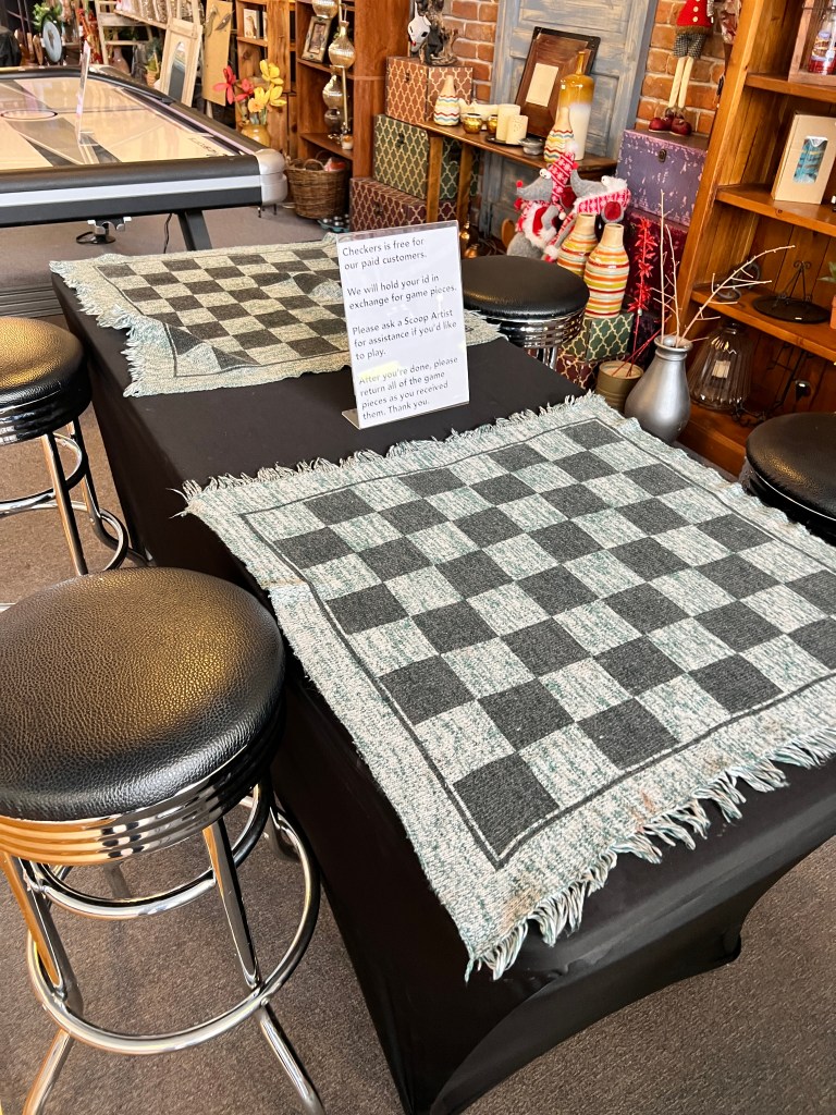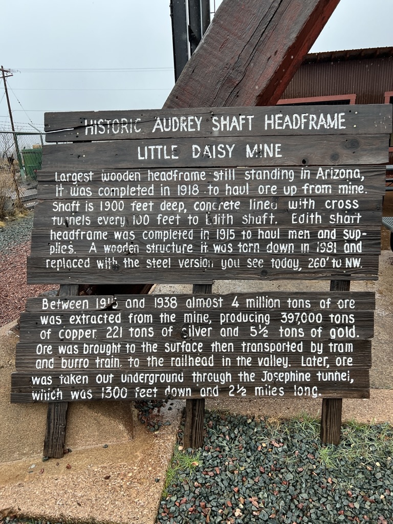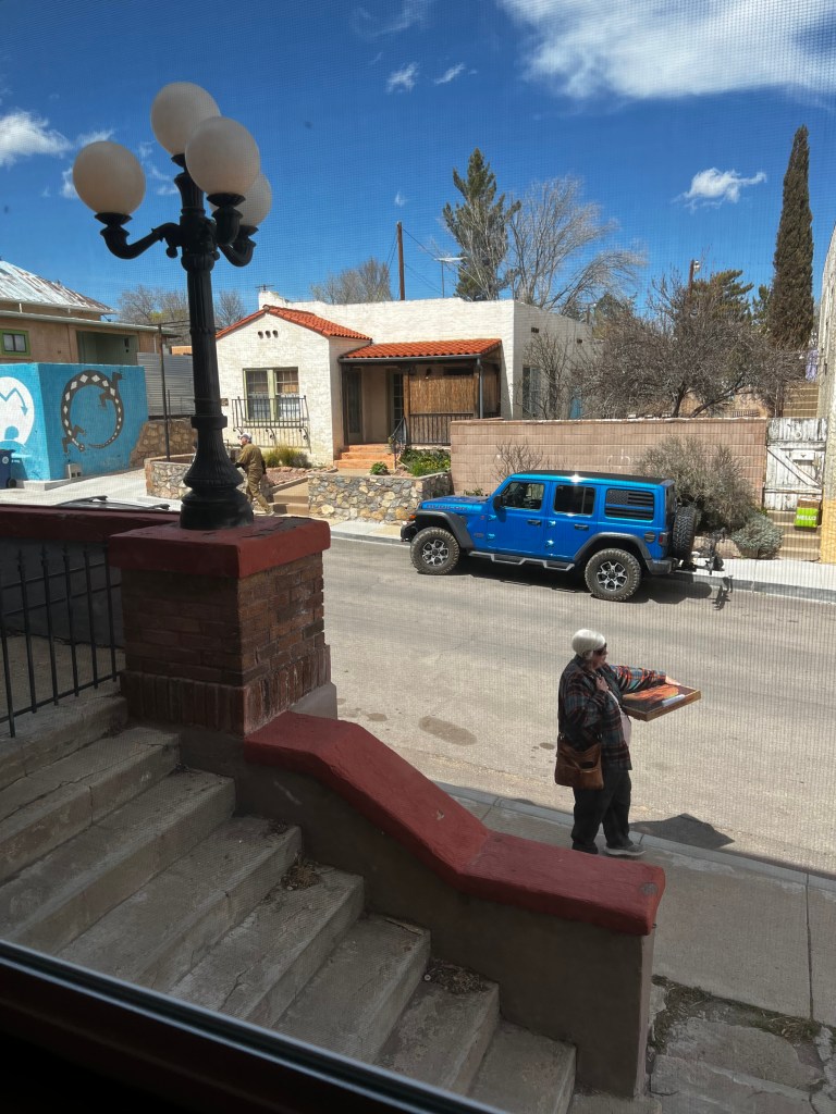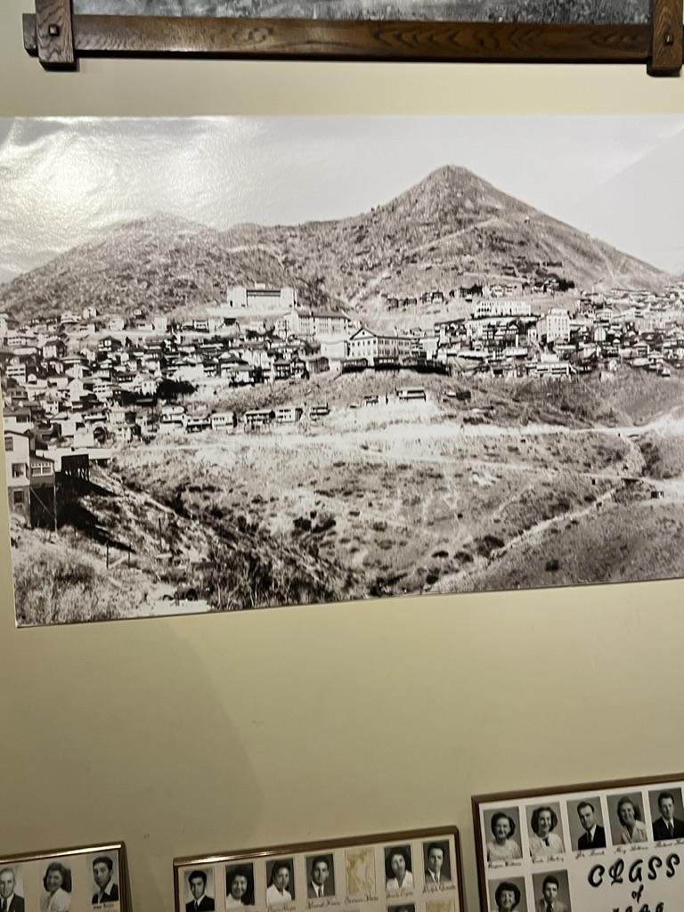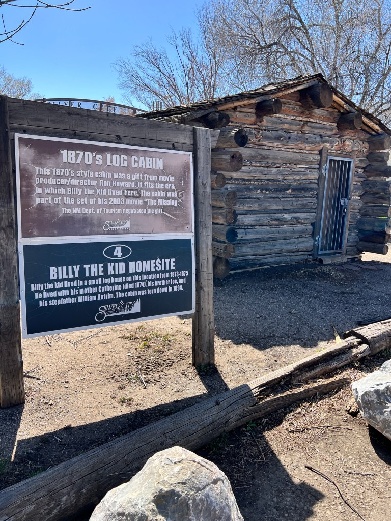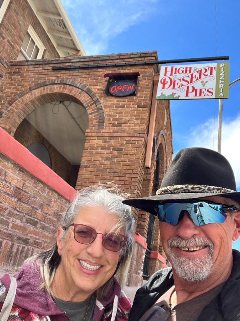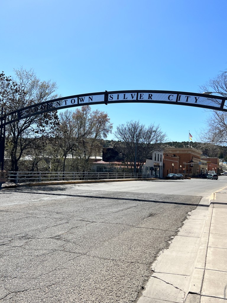 Our first stop in NM was in Silver City. As you drive north into the city you can see the huge open pit mine that gives the city it’s name. Silver, copper, gold and other minerals are all being pulled from the ground. The size of the operation is astounding. We had arrived a day earlier than planned at the Manzano’s RV park and our space was not available. They did have a boondocking (no hookups) space available and we parked there for the night. The next day we moved into our space (#15) for 2 days and then had to move to space #22 for the remainder of our stay. Not a huge inconvenience and the folks were extremely friendly. We took a drive into the city and walked the downtown area. The buildings are old and historic and has a very ‘home town’ feel. A quick stop in the Visitor’s Center to gather some information and marvel at the murals painted on the walls of the Center and we were on our way. There is a metal arch announcing the entry into Silver City. As you cross under the arch, you immediately see a huge ditch with water running through it. This is called The Ditch. When Silver City was originally founded, The Ditch was Main Street. The founders failed to realize that their Main Street was also the main channel for flooding waters. The Ditch is now 20 ft deep and and has walking paths along it. Obviously Main Street was moved. The majority of the streets in the historic area are narrow and are designated as One Way. The Ice Cream shops boast homemade ice cream and they are fantastic. The Ice Cream Emporium boasts 36 flavors of homemade ice cream. The interior is designed as a gathering place with several tables for sitting, table sized checker boards, air hockey and other games. The Army/Navy store is as authentic as you can find. It reminded me of the Surplus store in Mesa many years ago. High Desert Pies is a pizzeria with some excellent food with a view of the street from 2 stories up. It was a nice relaxing place.