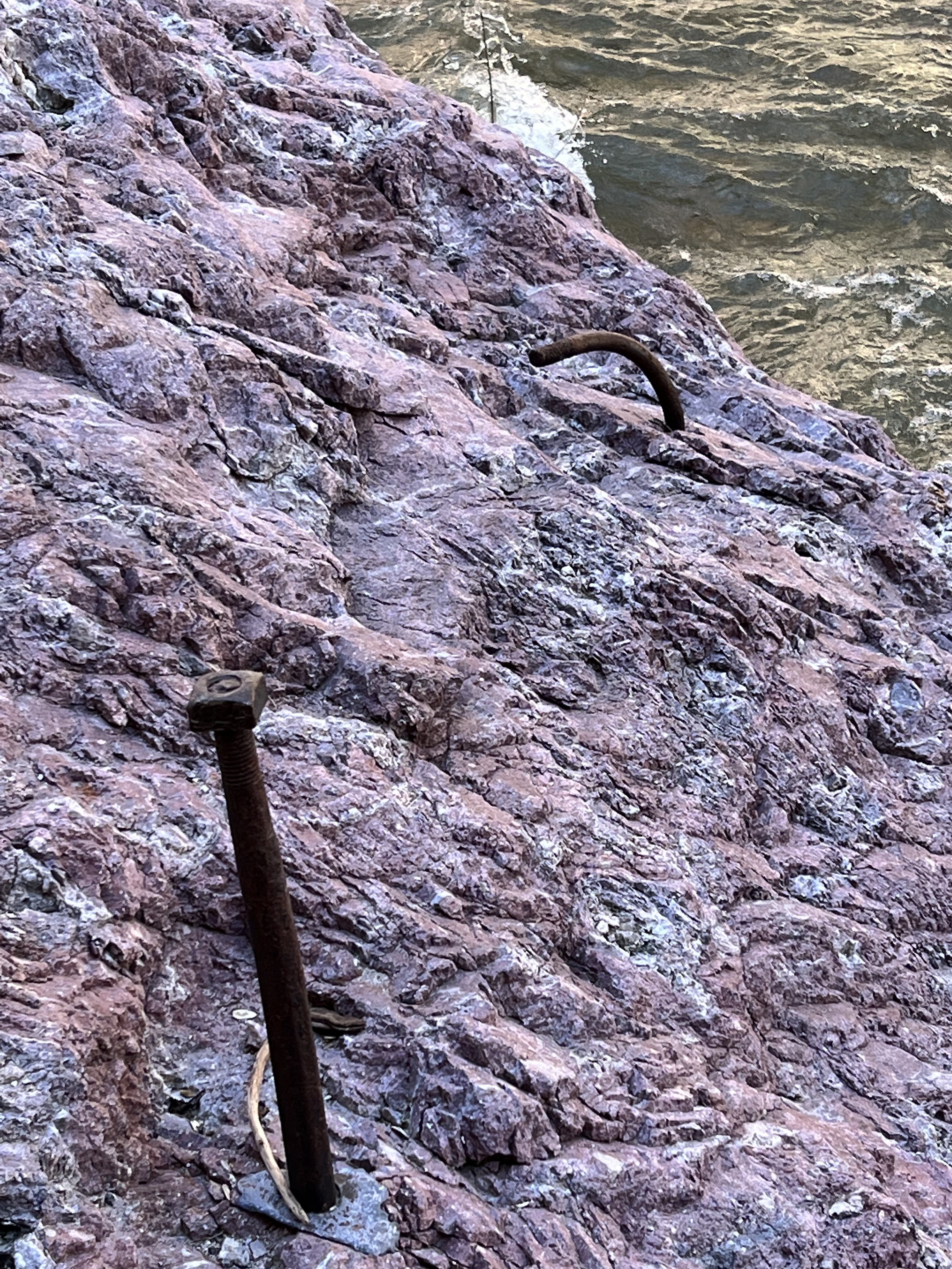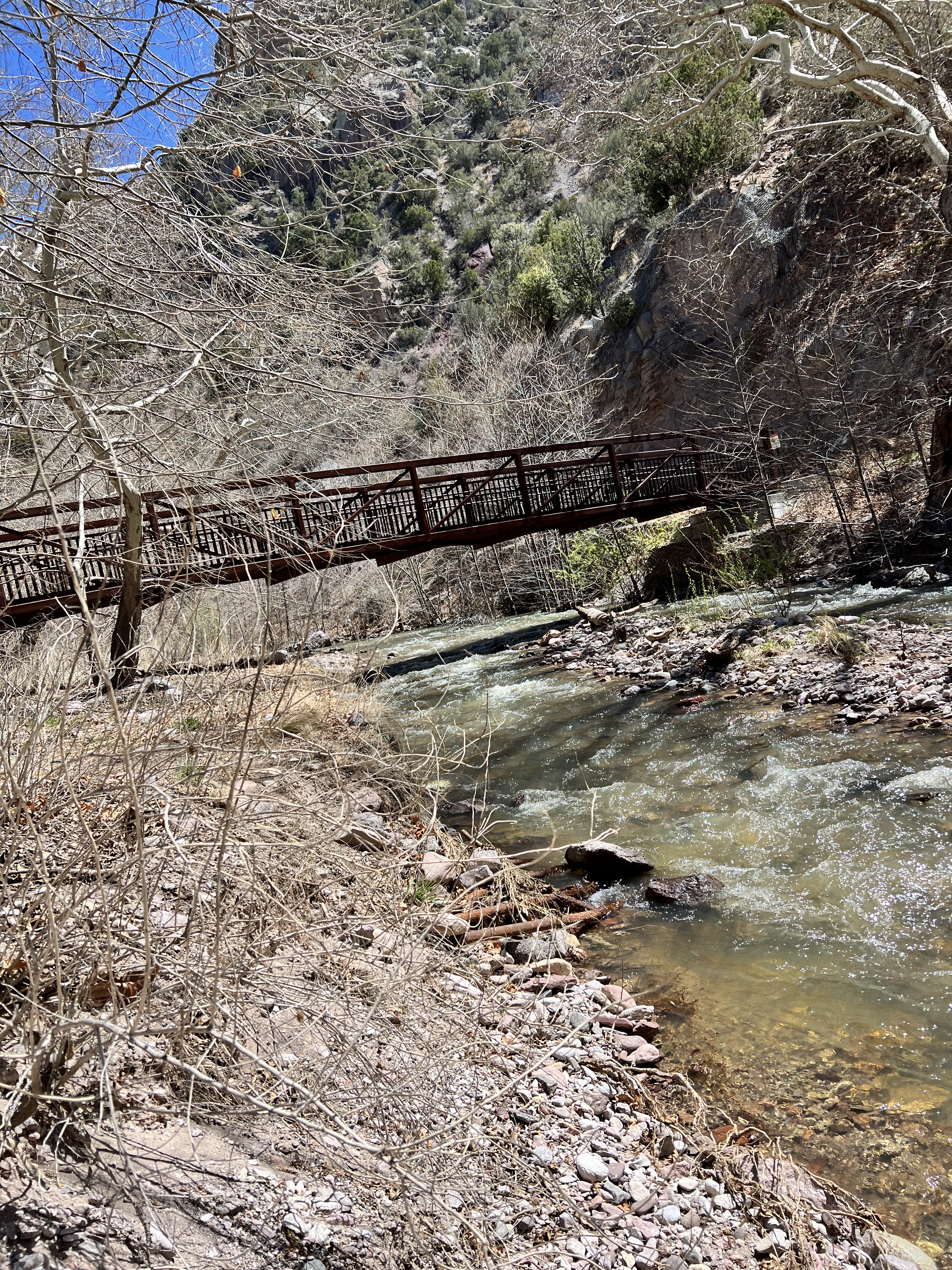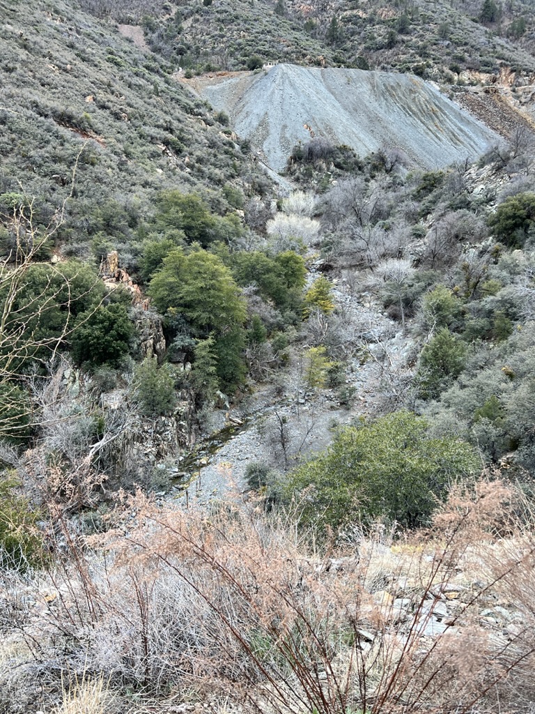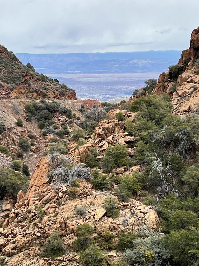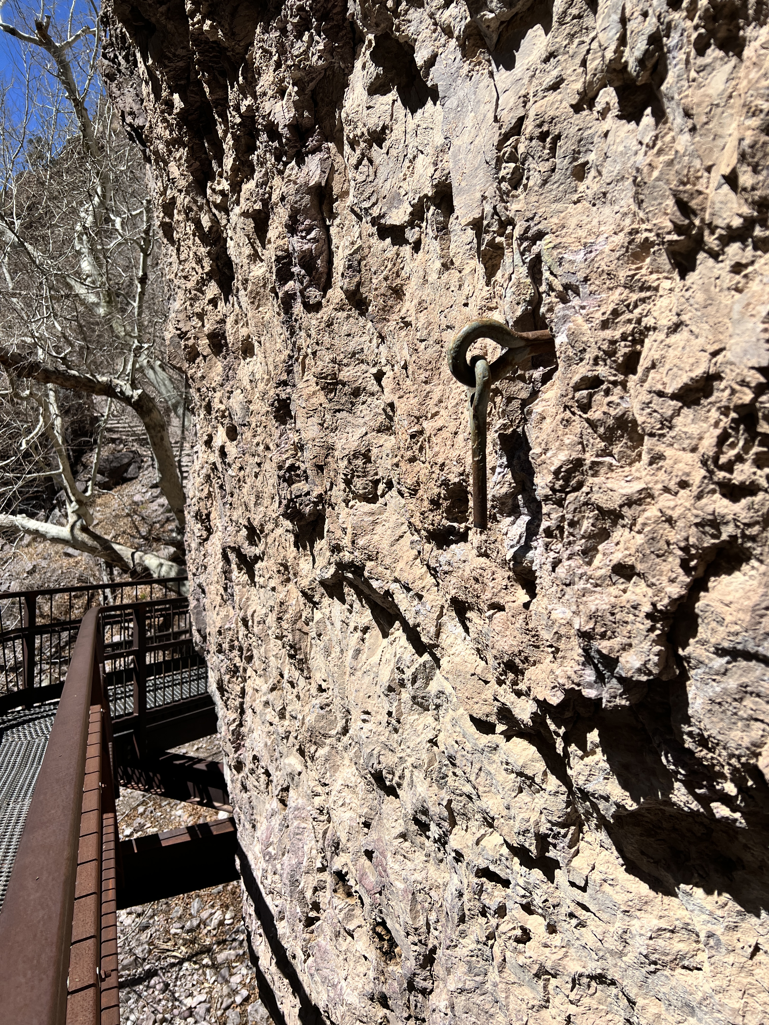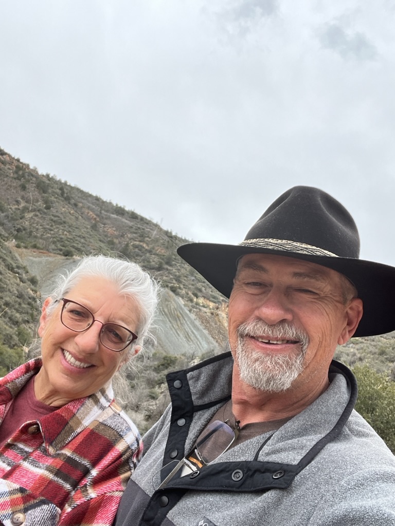 We took a drive out to Whitewater Canyon to view the Catwalk. This was the location of a mining operation long, long ago. The catwalk has since been reconstructed but is still in the original location. The catwalk was used to hold a pipeline that carried water from the canyon down to the mouth of the canyon to provide power for the mill and drinking water for the workers. The miners would have to traverse the catwalk with nimble feet less they fall into the gorge with the roaring waters. As you walk along the concrete and steel catwalk, you can still see remnants of the original catwalk with steel cables attached to rings that are pounded into the rock walls. While eating lunch we fell into a conversation with Chris. He is a nomad from CA who is living in his Sprinter van. He was a life guard, a life guard instructor, a CHP officer and then moved into Search & Rescue over the course of his life. He had ‘Covid hair’ as he called it. It was silver as he is a couple of years older than me, braided and landed at the middle of his back. He loved to talk and said that was from his time of solitude during Covid.