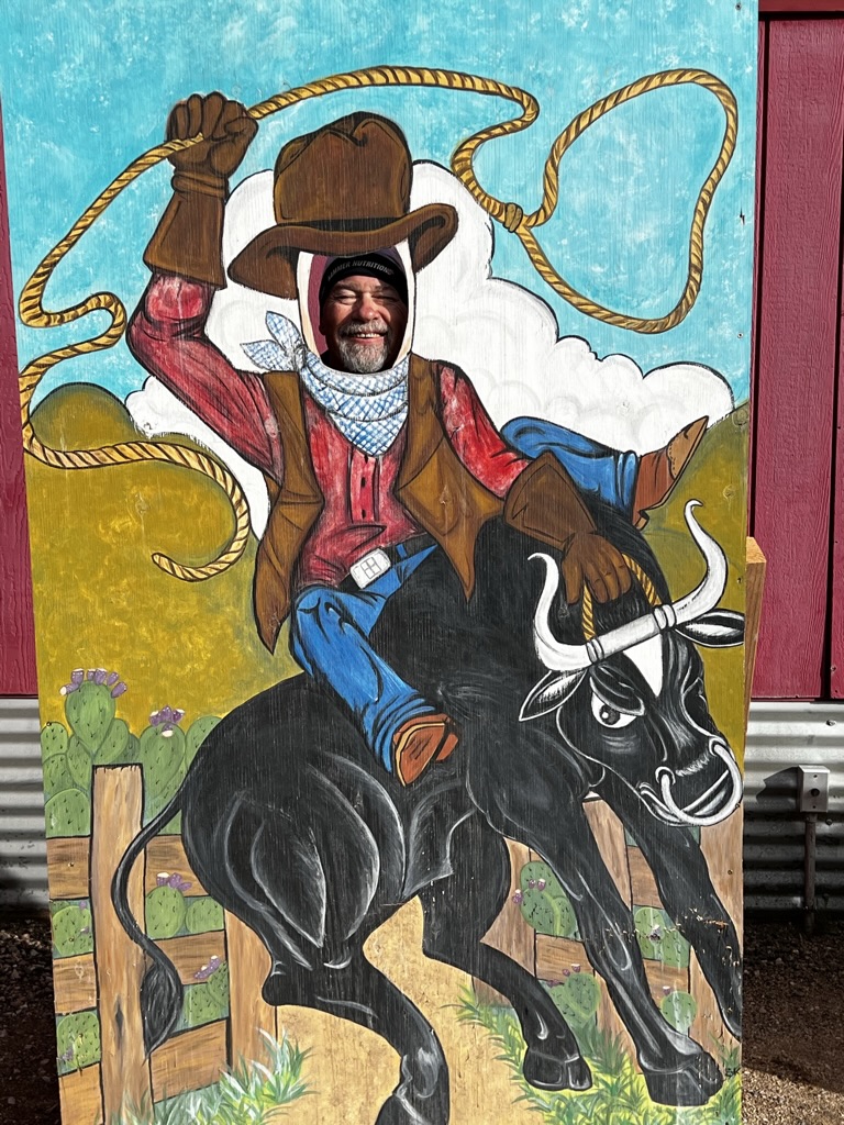 We were on the road on Thursday, March 16 headed to Lake Havasu for an MTB race. Sarge had to say goodbye to Riley, the other cat in the RV park. In the race I did much better and had a fun race. The race was a bit different than others. I went out hard and hit the single track in 3rd. 1st was gone, not to be caught. 2nd slowly pulled away and I couldn’t hang with him. Jeff sat on my wheel until about mile 5 when he pulled around. He finished 3rd. I was too hot going into a corner and had to slow and was passed. At the top of a long climb, I stalled and the chain fell off. Got passed again, now I’m sitting in 6th. A mile later I caught #5 and I’m back in 5th. As I started the 2nd lap, I could see 4th in front of me about 30 seconds ahead. I was able to catch him several minutes later. We fist bumped as I passed and we encouraged each other. In a steep climb, I stalled again and he rode past me. At the 18 mile mark of a 20 mile race, I was able to catch and pass him again and that’s how it ended. I finished in 4th. It was fun chasing and trading places with John. That’s how racing should be. We had a chance to visit with a lot of people and Teri was talking about riding, racing, and our adventures past and future. We allow Sarge to wander around the campsite and monitor him through an Apple AirTag. Surprisingly he stayed very close to the motorhome and didn’t roam as far as he has been known to. We asked him about this but all he said was ‘meow’.