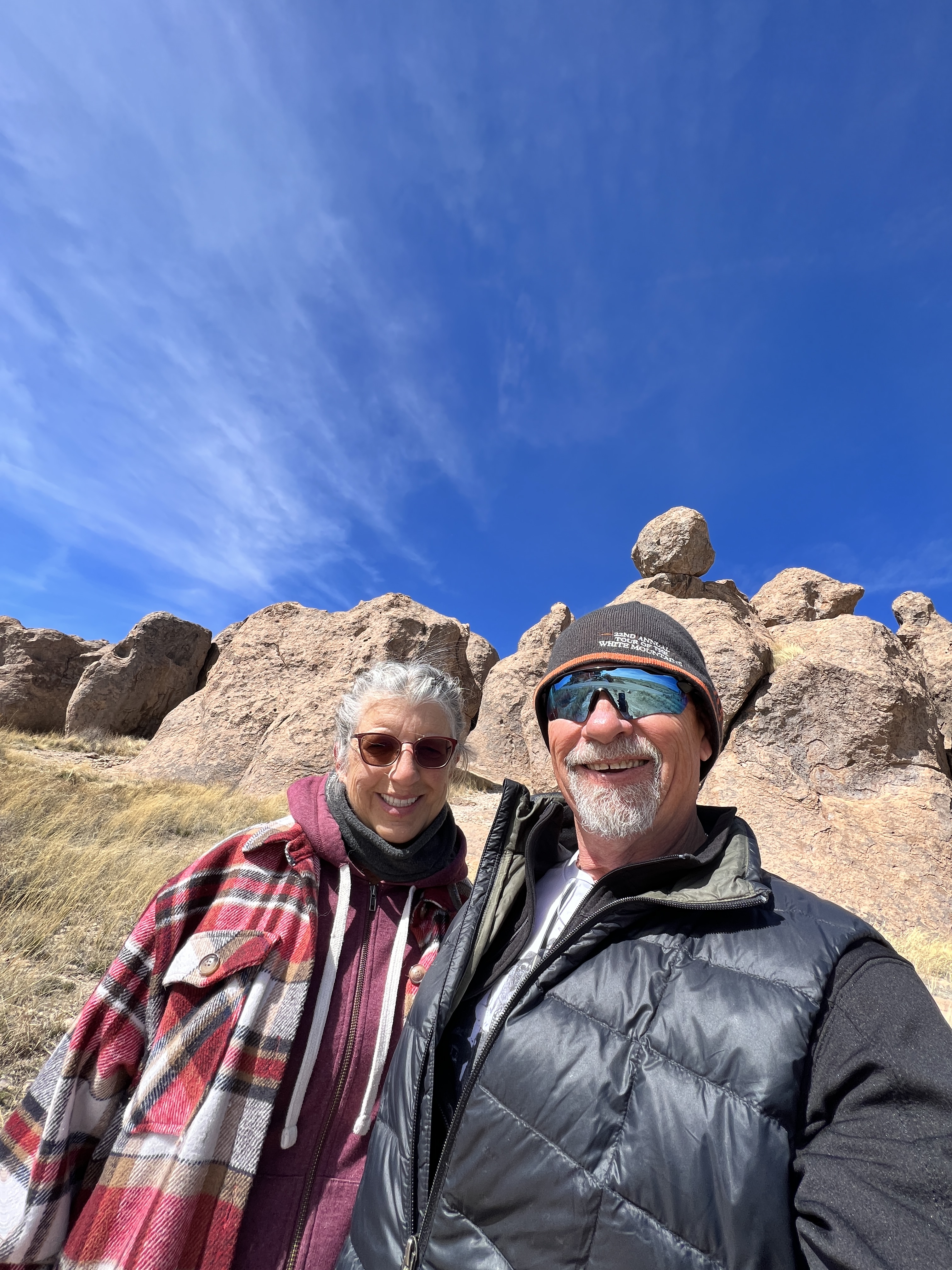 We took a drive out to the City of Rocks State Park to visit with the Flintstones and Rubbles. Unfortunately they were out so we just toured the City. These are rock formations that have been carved by water and wind providing paths through the towering rock skyscrapers. Some very interesting formations were seen. Some formations you wonder how they ever got that way, especially the round rock boulder that is balancing on top of 3 smaller rocks.