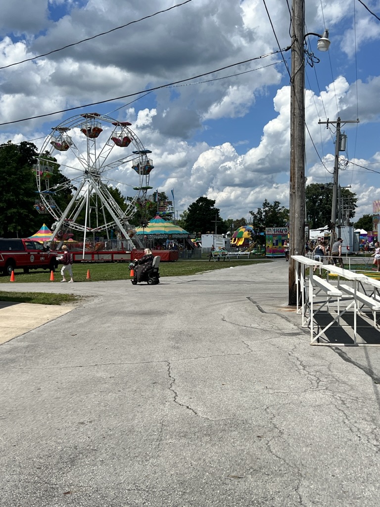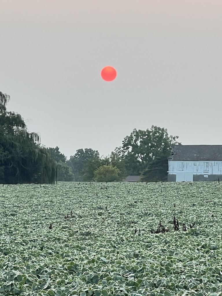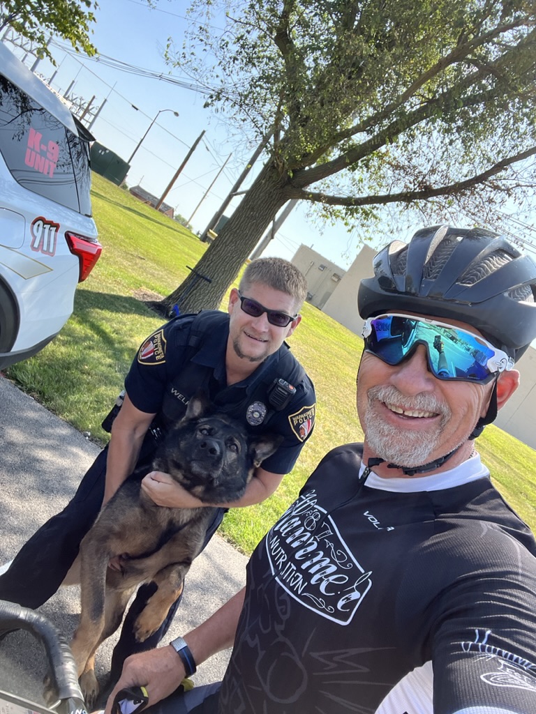 We then zoomed into Wapakoneta, OH. This is the home town of Neil Armstrong, the first man on the moon. We toured the Armstrong Museum which we found fascinating. The roads had changed in that there was now a shoulder that would support bike riding. There were no mtb trails in the area. Each day I rode past the fields of corn and soy beans and marveled at how much farm land there was in the area. On one of my rides I rolled through the center of town. A police officer was parked near the town park with his window rolled down. I pulled up and asked if he had a few minutes. The officer was Joe Welker. We then began to chat about his work in this small town compared to my career. I noticed he was a K9 and we chatted about his dog, Fox. He opened the kennel door which allowed Fox to poke his head into the drivers area. Fox poked his head forward and laid it on Joe’s shoulder. It was obvious this young, large german shepherd loved Joe. Joe let Fox out of the car and Fox eagerly walked up to me to get some attention. Joe displays his dog at various school and community functions on a regular basis. Seeing Fox’s disposition I can see why he would be a great asset for developing community support for the PD. I wouldn’t want to meet Fox in a dark alley however. Joe suggested we stop and see the Temple of Tolerance in downtown before we left the area. We said our goodbye’s and I rode home. About an hour after getting home, there was a knock on the door. It was Joe. He brought over a Wapokoneta PD shoulder patch, cloth badge and some stickers for trading. Of course we had to take another photo. The park owner drove through while we were talking and fearfully asked if everything was ok. He said they don’t see the police in the park very often. We explained we were just comparing stories. The owner invited Joe and other officers to visit anytime. We also stumbled upon a county fair and took a walk through admiring the animals and the food trucks. On one of my morning rides, I couldn’t believe the view of the sun as it rose into the sky.