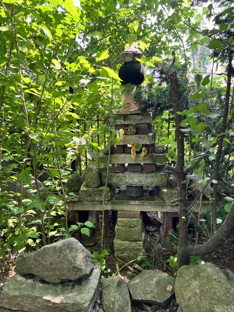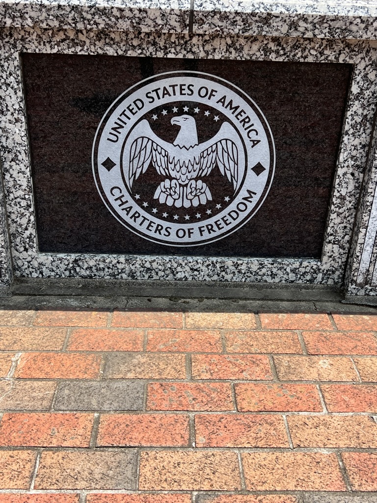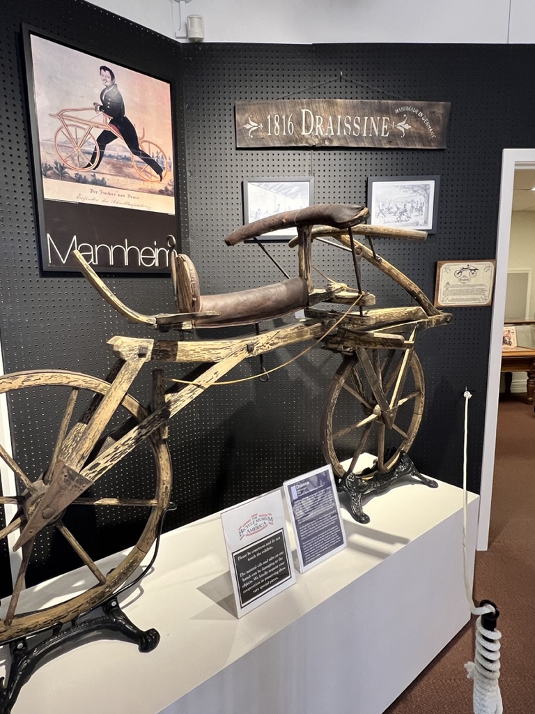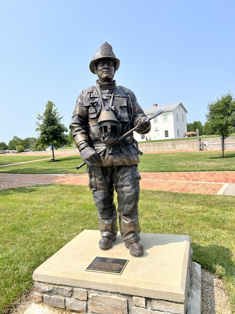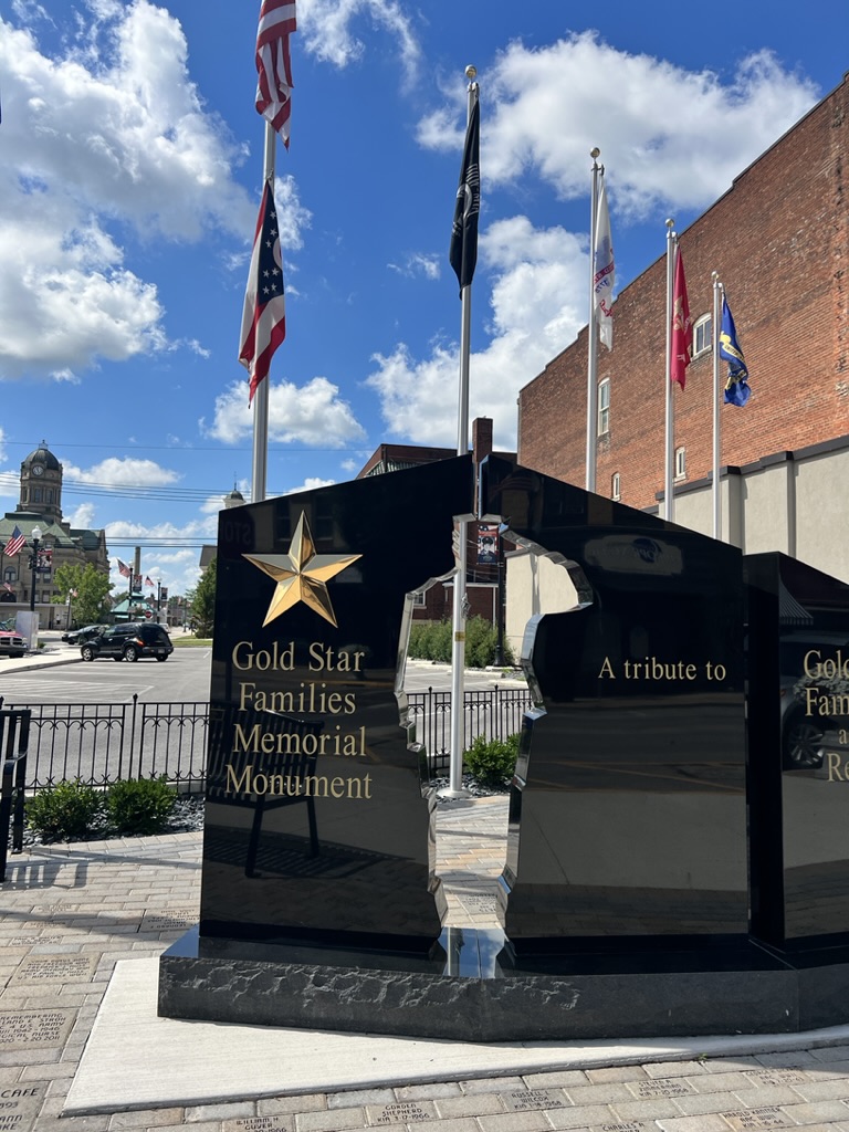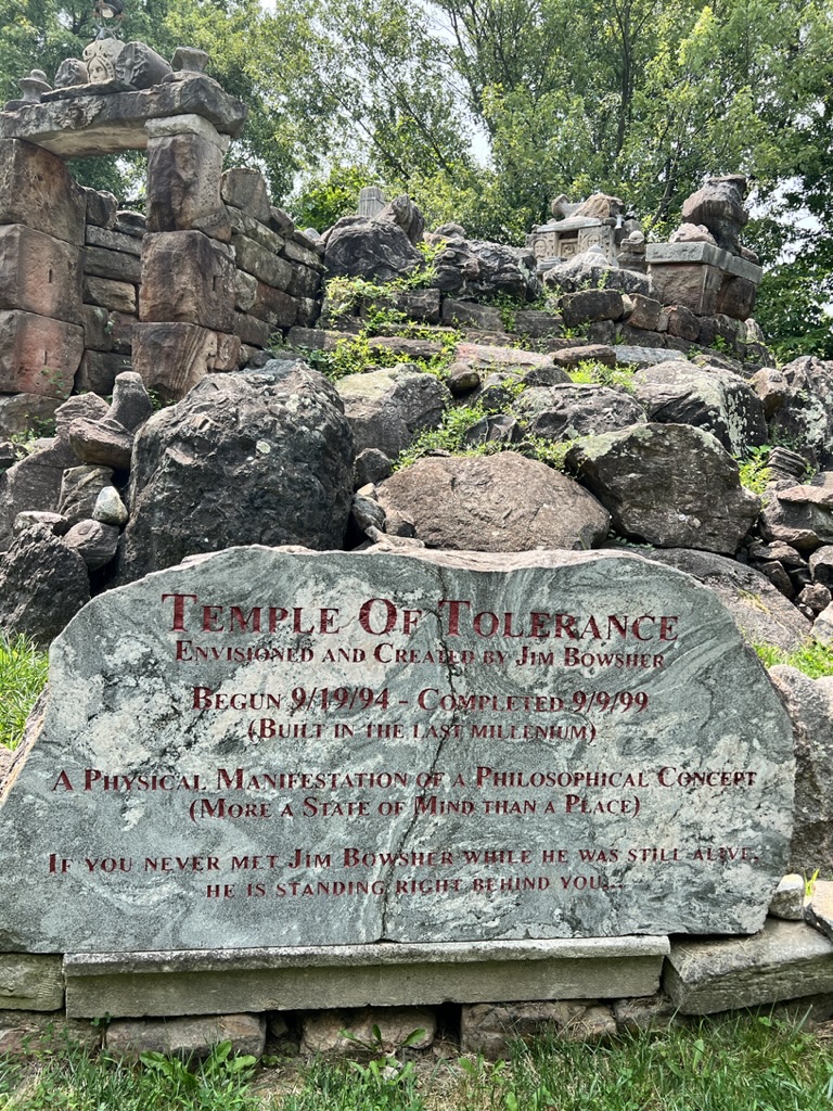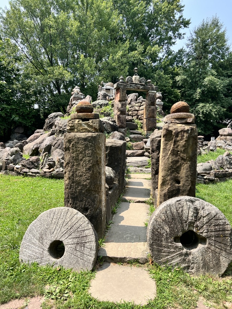 While we were in the area we visited the Bicycle Museum of America. This is a private collection of bicycles spanning the decades. Some of the bikes were the predecessor of e-bikes and shaft drive bikes. PeeWee Herman’s bike was on display as well. Teri entered her very first bicycle race while touring the museum. A machine in which you spin a handle to make the bicycle go around in a circle was on display. There are 2 handles so 2 people can race their bicycle against each other. The Museum was next door to the Canal Lock 1 of the Miami-Erie canal. Boats would reach this lock and would be turned around to head back down the river/canal. One afternoon we found the Temple of Tolerance. A man had turned his enormous back yard into a world of stone art. He had dedicated his “garden” to giving troubled souls a place to decompress and to find solace. His career is that of an archeologist and he has a number a newspaper clippings posted that explain his mission of peace. The path through the yard was lined with stone walls and a tunnel of vegetation. There were artifacts from around the world. The Temple was a mound of rocks that had been piled up about 15 feet high. It was a very relaxing stroll. One of the things I noticed both last year and this year is that the streets of Ohio towns are lined with banners of military service people. The street light poles throughout the towns fly banners commemorating the service men and women from the town and from the area.