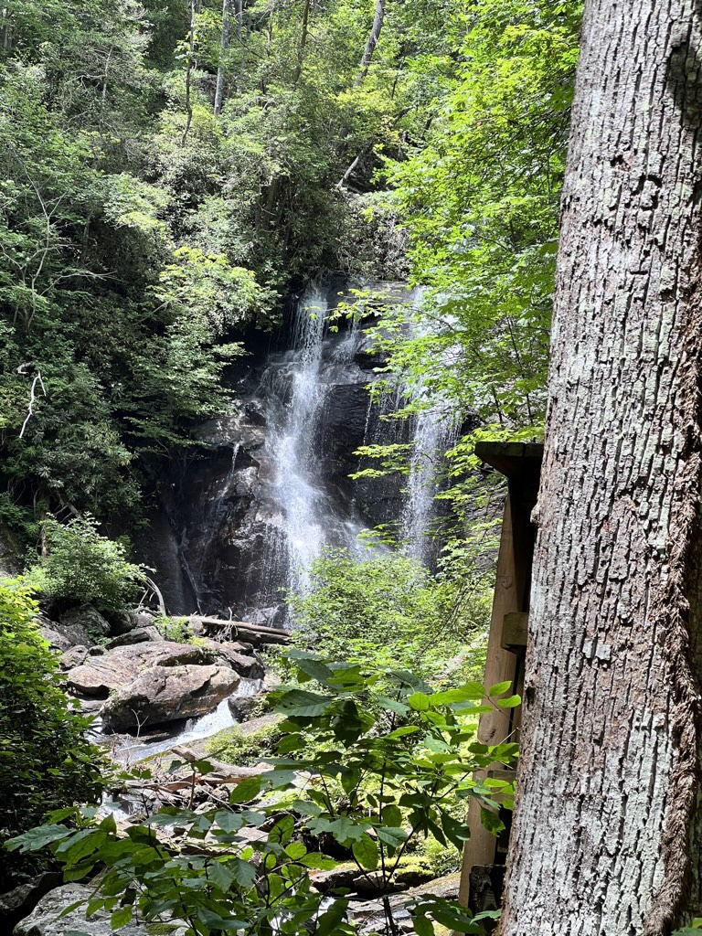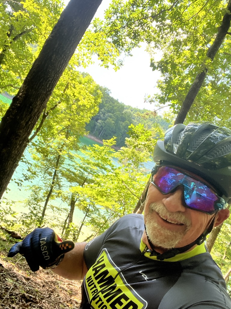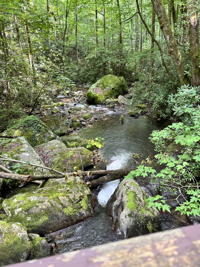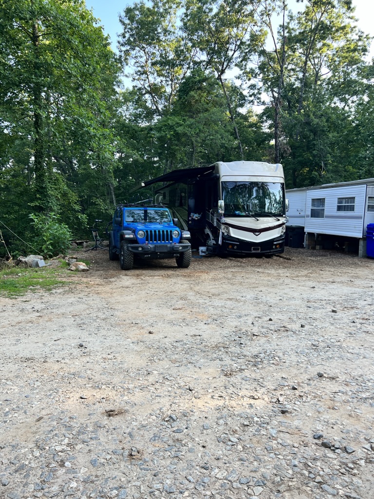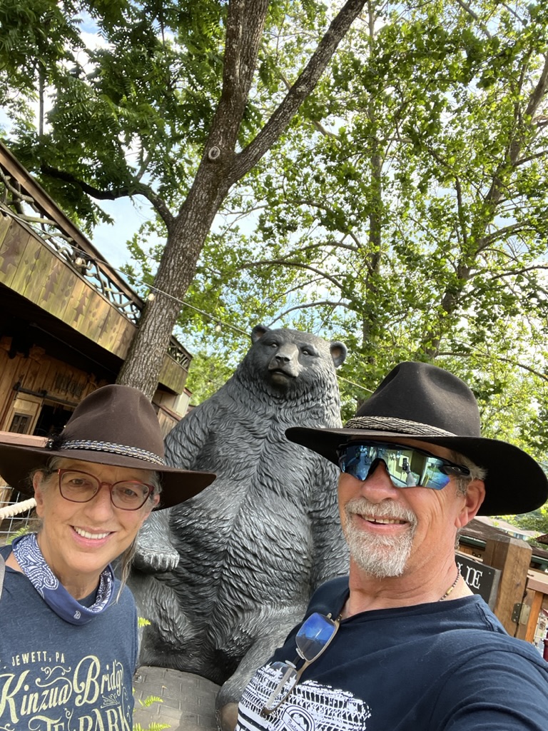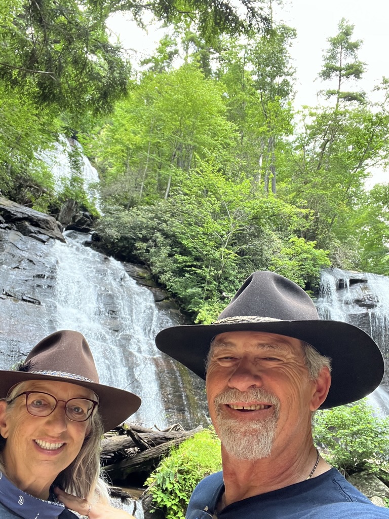 The next stop was Helen, GA. We stayed at the Hearthstone Cabins and RV Park. This park was not what we were expecting. It was more of a national forest service campground than an RV park. Our motorhome was a bit big for the park. We arrived from what we later determined was the wrong direction. The road from downtown to the park was a very winding and narrow road. Fortunately we didn’t experience any oncoming traffic as this road was about 1 1/2 lanes wide. I don’t know how we would have maneuvered past any other vehicles. Finally we reached the entrance to the park. The road had a slight downward curve to the right and the turn into the park was less than 90 degrees. The short version is that I blocked the entire road, had to unhook the jeep while blocking the road and had to do a 4 point turn to get the motorhome into the park lane and off the road. Then we had to wait for the owners to show up and guide us in. Liz is one of the owners and she did an amazing job of making sure we were comfortably parked in our spot. This took some maneuvering to get backed into our spot but we got it done. The back 4 ft of the motorhome was hanging off the edge of a bank. When the stabilizer jacks were lowered, they just sank into the ground about a foot. You might remember the same problem last month if you read the previous post. Liz said she would get some rocks to fill the holes and she returned shortly with several buckets full of river rocks to fill the holes. Then we lowered the jacks again and all was well. This park seemed to have a lot of long term campers but everyone we saw were friendly. We spent a week in the area. We visited Unicoi State Park for some mtb riding and hiking and fishing. While riding the South trail I came across a stream that I decided not to cross after looking for an easy crossing. The water was shin deep and I didn’t feel like riding in wet shoes and socks. The north trail was just as scenic but provided some excitement. This day I was the nail and not the hammer. I was cruising along downhill stretch until I wasn’t. The trail was part of a creek bed that was rocky and sandy. As I bounced along, the front tire buried itself into some soft sand and stopped abruptly on a rock. The front wheel and handlebars turned sharply to the right and I was airborne. I landed on my left side. First thing I did was check the bike. If you know, you know. The bike was ok. I had some scrapes on my leg but otherwise I was ok. I finished the ride without further mishap. The next day I found and felt the bruising on the hip and legs. We fished the river running through the park and Teri had some success. We took a drive into Cleveland, GA for groceries and stopped for lunch. There were a lot of fast food joints but few diners.