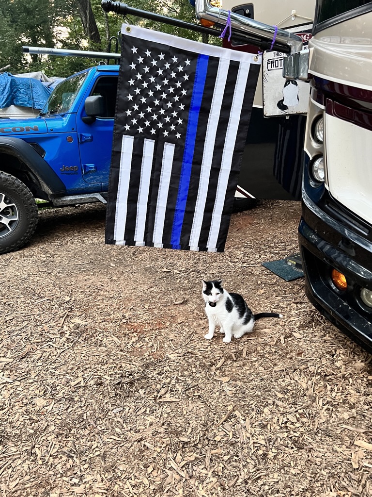 As we continued moving northward our next stop was Heiskill, TN north of Knoxville. This stop had some drama to it. One morning we let Sarge out of the motorhome around 7am like we do almost every day. It surprised us that we hadn’t seen him by noon as he normally checks in around 9 or 10am for a snack. We tried to call him to no avail. His tracker was not connecting to Teri’s phone indicating he was out of bluetooth range and had not connected to any other type of wifi or bluetooth device. The campground is surrounded by heavy woods and undergrowth. We figured he was hunkered down as it had been raining with thunder and lightning all morning. We went out into the woods on a trail and called for him with no luck. That night we didn’t sleep well. I hadn’t realized how attached I am to him. We tried to console each other and discussed the various options. The next morning he was still missing. We walked the trail that surrounds the camp calling for him without success. I bushwacked my way through the forest and undergrowth until I came to several homes. I saw a couple in their back yard and approached. I explained why I was bothering them and they couldn’t have been more friendly. They were Ed and Donna Paris. We talked for bit and they said they would keep an eye out for Sarge. Teri had created a missing cat flyer so we drove into Knoxville to have several copies made and laminated. We mentioned to several of our neighbors that he had gone on a walkabout and hadn’t returned. That evening as we were sitting at the dining table about 7pm (Sarge has been gone for 36 hours) I checked Teri’s Find My phone app. It showed Sarge had connected to a wifi an hour earlier. He was about 1 mile away as the crow flies but it was more like 2 miles as he had to climb and descend the ridge. The tracker had connected at a house on the other side of Bullrun Ridge. We excitedly jumped into the Jeep and drove around the ridge to the house. There are no trails, paths, roads, etc over the ridge. We pulled into the driveway and walked up to the front door. Les and Meg answered my knocking on the door. I apologized for bothering them so late but said we were looking for our lost cat. Before I could say another word she asked if it was a white and black cat. I said yes and she said they had seen one in the morning out near their vehicles. They grabbed jackets and we went looking. As soon as we got near their Jeep while calling for Sarge, he started to announce his presence. We were ecstatic. Sarge was excited to see us and buried his face in the small bowl of food I put down for him. Les and Meg Lockhart explained they had seem him that morning near their garage but didn’t check him close as they believed he probably belonged to one of the neighbors. They don’t have a neighbor within sight of their house. We chatted for a bit and were amazed at the amount of country he had traveled. We all slept better that night.
