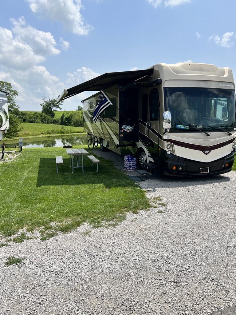 We were disappointed in our visit. We had expected there to be plenty of riding and hiking areas as well as the history. It just didn’t meet our expectations. The weather was hot and humid and we suffered through a rain downpour. This was not one of our favorite stops. The campground, Whispering Hills RV Park, was a nice one and one we would stay at again if we were to visit the area again. We decided to leave a couple days earlier than we had planned due to the lack of interest in the area. As we pulled out of our site and were exiting the park, we drove over a small speed bump. The back end of the coach bounced more than usual and just didn’t feel right. We stopped at the park exit and I got out and walked around the coach. It become obvious right away that the rear airbags had not inflated. After doing some quick checking and not being able to correct it, we pulled back into our camp spot to regroup. One of the camp hosts guided us as we backed into the camp site. I got out of the coach to check to make sure we were situated in the space properly and I noticed that the bags had inflated. I thanked the camp host for backing us in and for correcting the airbag issue and we pulled out and were back on the road. As of this writing, we’ve had no further issues and I don’t know what had caused the problem.