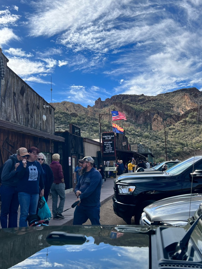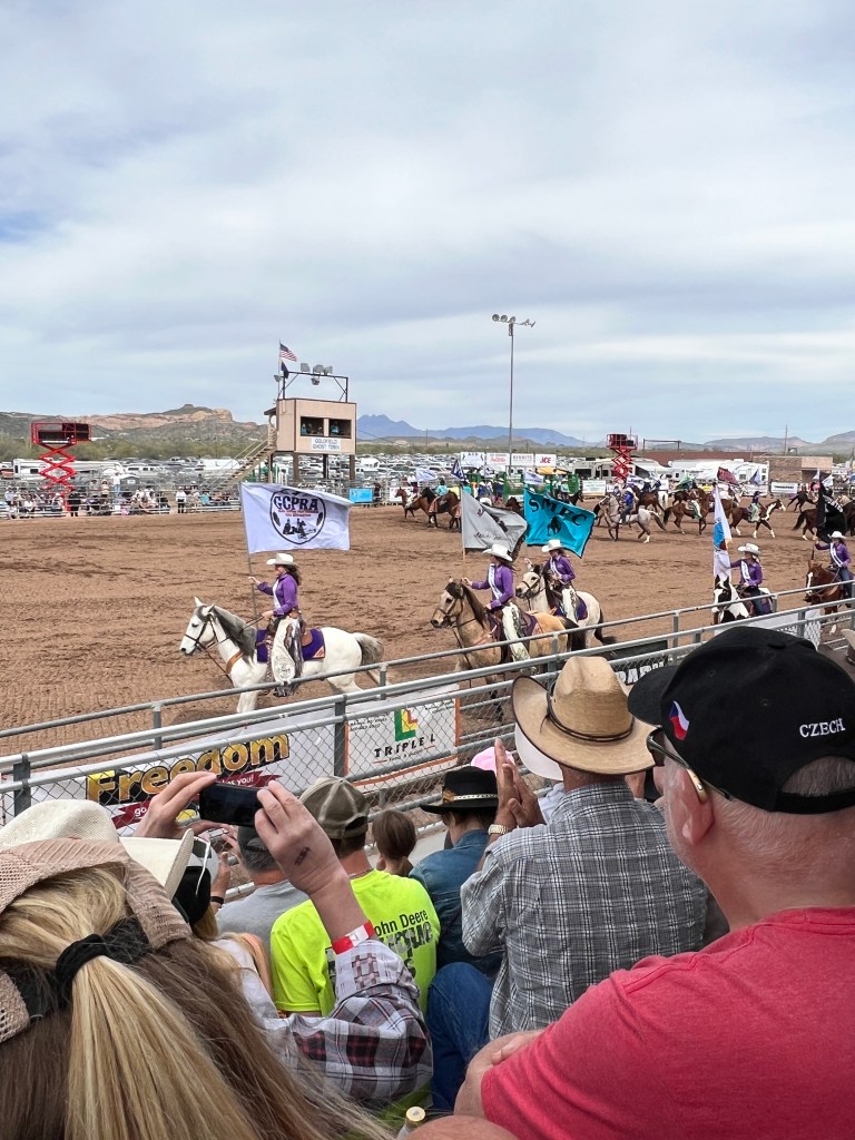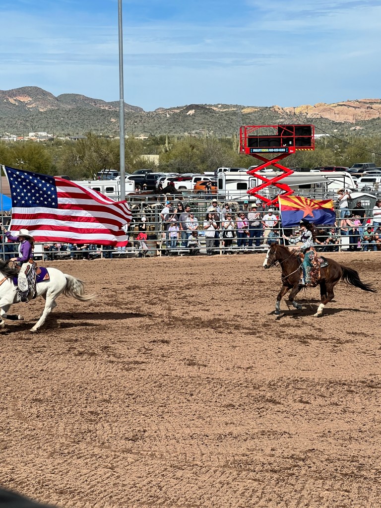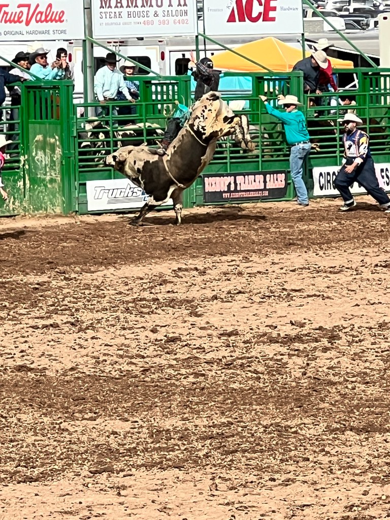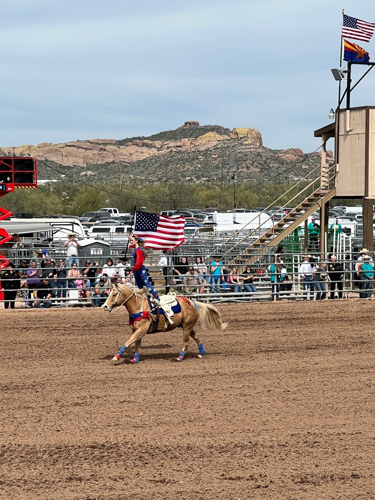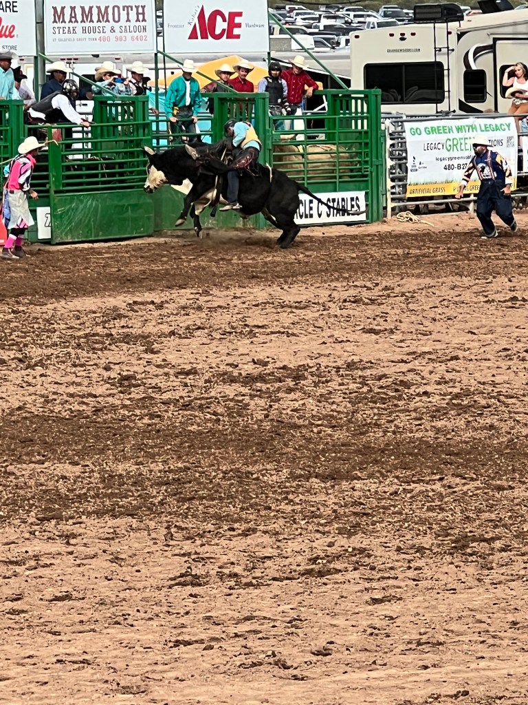 On another day we all attended the Lost Dutchman Days Rodeo. This is a professionally sanctioned rodeo that lasts 3 days. It has the full compliment of events, saddle bronc, bareback, steer wrestling, calf roping, break-away roping for the women, barrel racing and the granddaddy- bull riding. It was a tough day for the cowboys and cowgirls but all gave everything they had. Rodeo is still all about God, Country, supporting the military and first responders. It can bring a tear to your eyes when the Star Spangled Banner is performed, the presentation of the colors and the tribute to all who have and are serving this country in so many capacities.