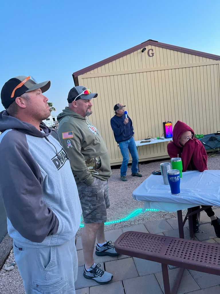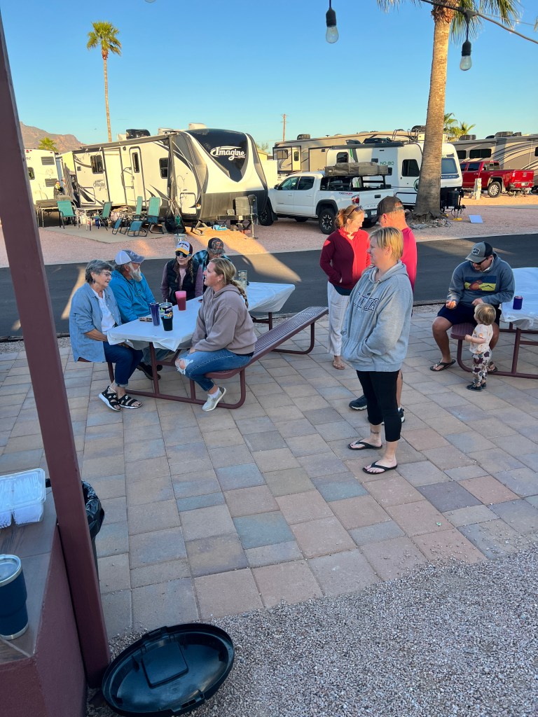 As I write this, we are on the road. As the weather heated up in AZ Megan and Devin headed east to the dreary weather of Iowa. Most recently they have been dealing with severe flooding of the lakes and canals. Fortunately neither they nor anyone else we know in the area have been directly affected but the devastation is heart breaking for so many. Don’t forget the tornadoes either. Before they left there was a BBQ at the park to say goodbye to many of the winter visitors as they packed and headed for other parts. The food was delicious and the company was great.