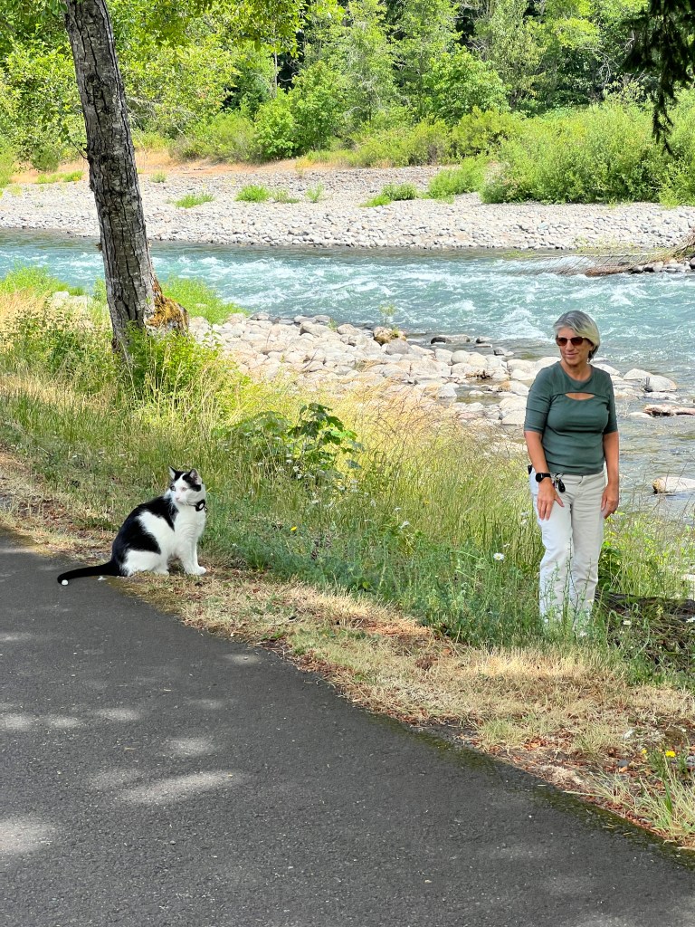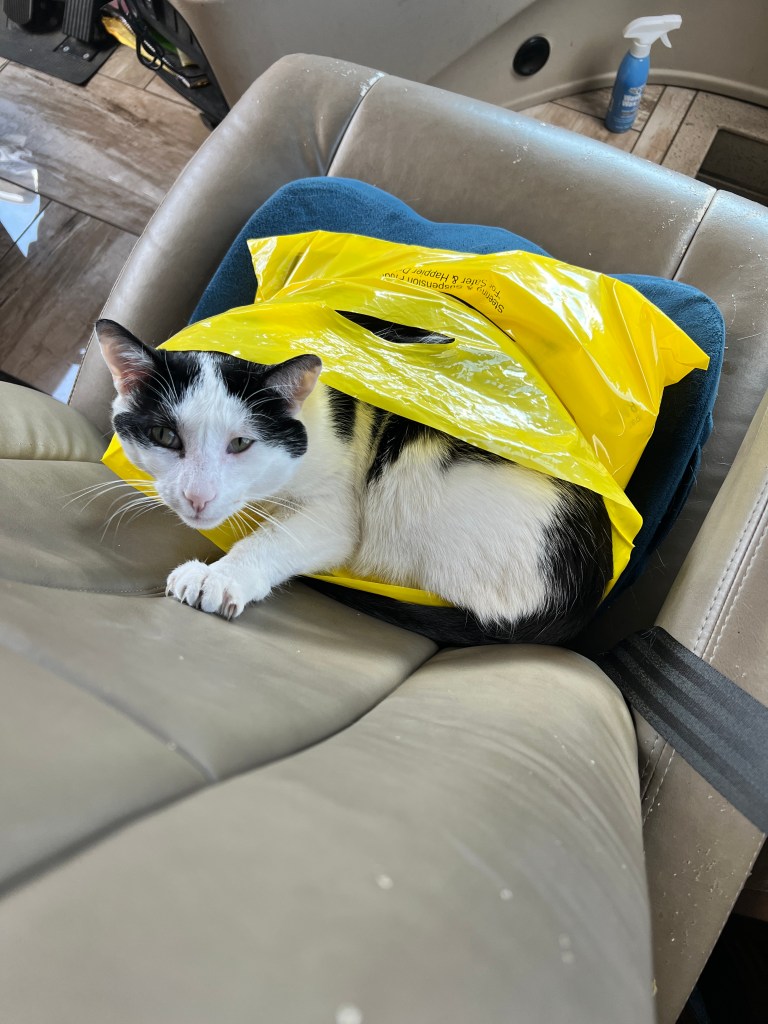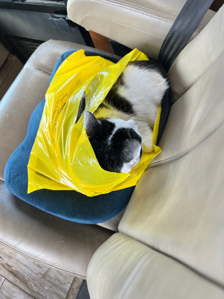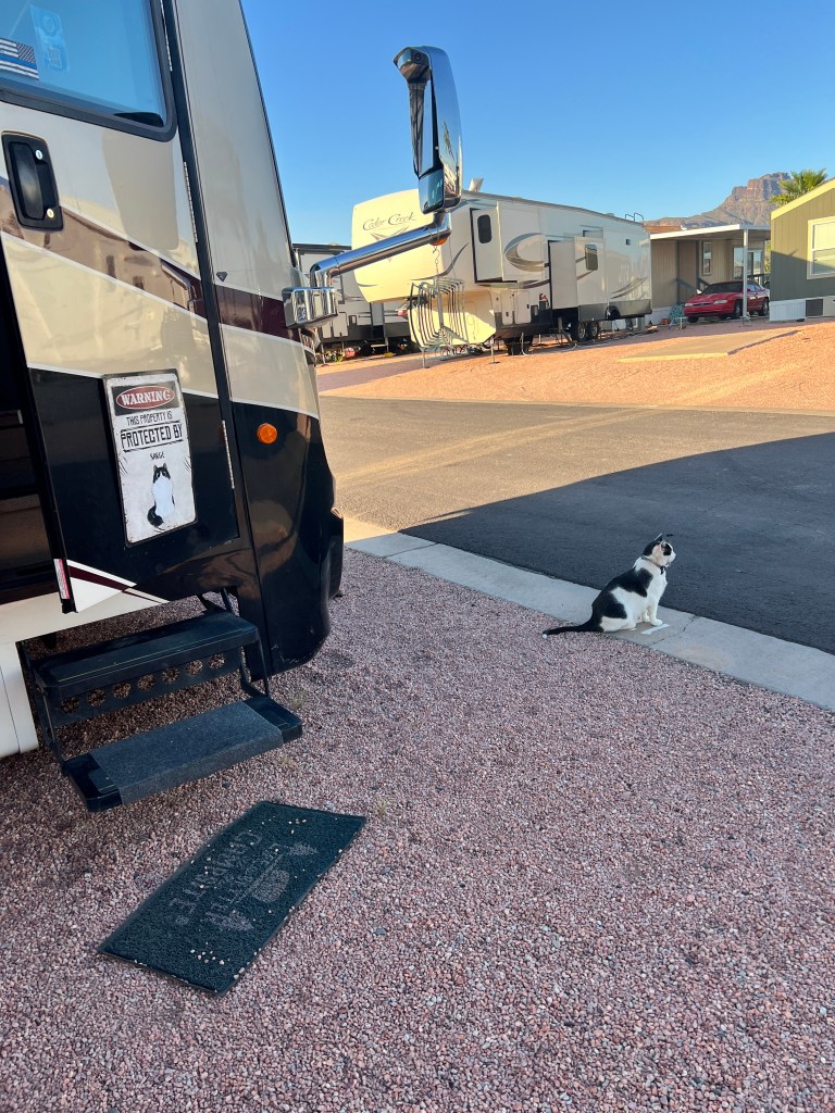 Sarge continues to adapt to life on the road. Recently he had been out on his usual walk around the park but when he returned, he was all out of sorts. His left eye was swollen shut, he was lethargic, he had a clump of matted hair on his neck. We called our usual vet clinic who could not fit him in to their schedule. We then called 1st Pet and they immediately made arrangements to see him. They were unable to determine what had caused the issue as they could not find any puncture marks or any debris in the eye. They did a complete checkup and we have found a new vet. They did provide us with some antibiotics and after a few days, the swelling went away and he is back to being his usual self. He did not want to wander out of the motorhome though which leads us to believe some animal got a hold of him. We believe it was some type of bird. As the swelling went down, we were able to see some scabs on his face, above his eye and along the left side of his mouth. In any case, he is fine and living well.