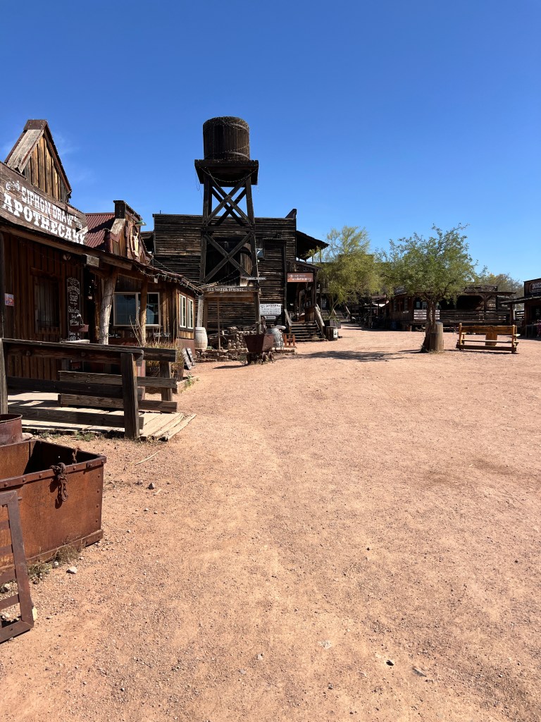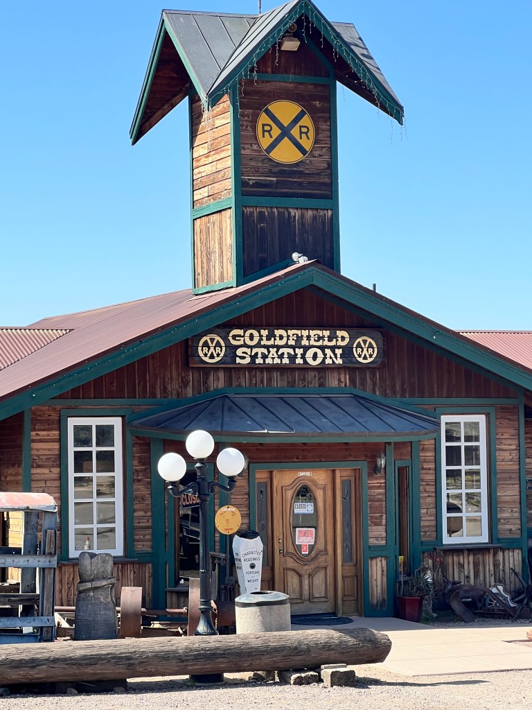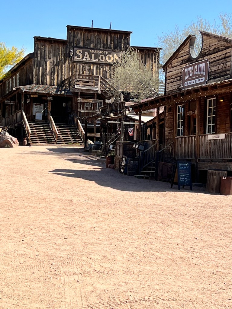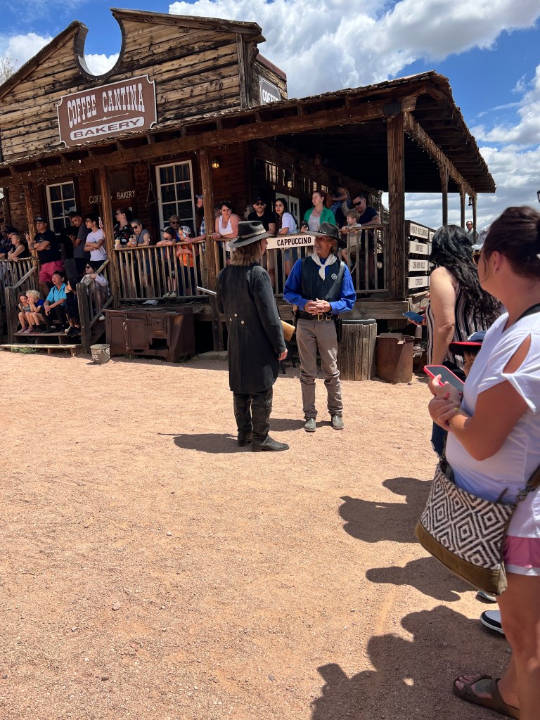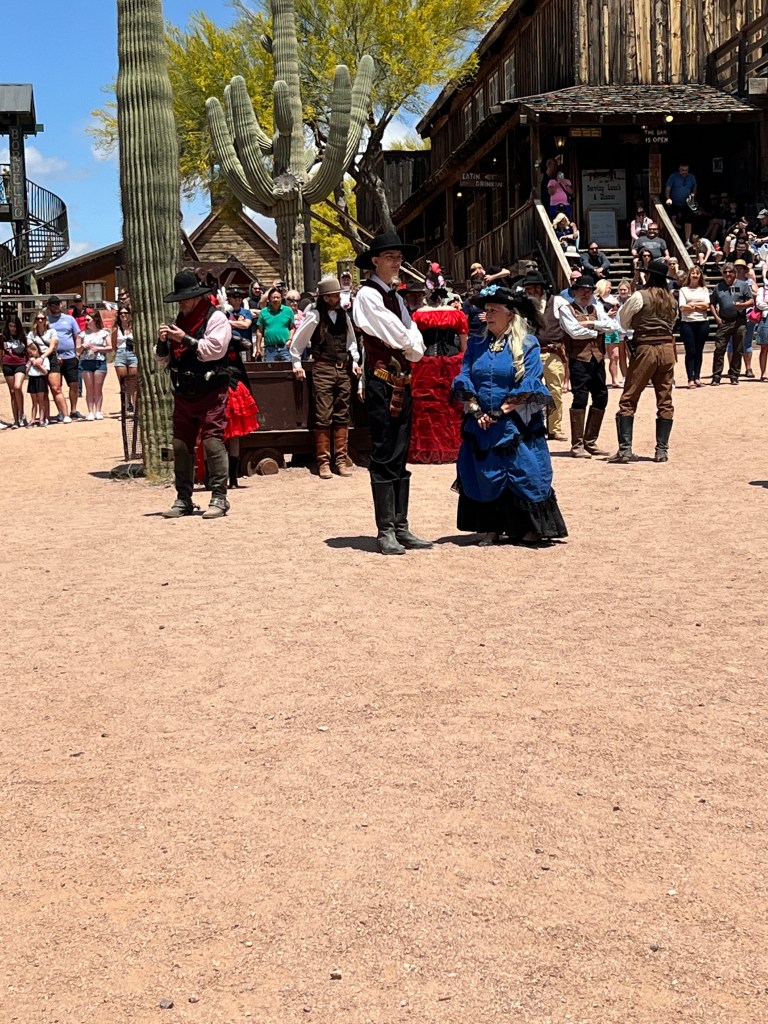 Have you been to the Goldfield Station aka Goldfield Ghost Town? It’s situated on the Apache Trail outside Apache Junction and is a replica of the historic Goldfield mining town. Take a walk along the boardwalk and see if you can hear the spurs jingling or the miners whooping it up. In any case, it is filled with history. Callie, Brett, Teri and I jumped on the steam locomotive for a perimeter trip of the town and then we walked into a gun fight in the streets.