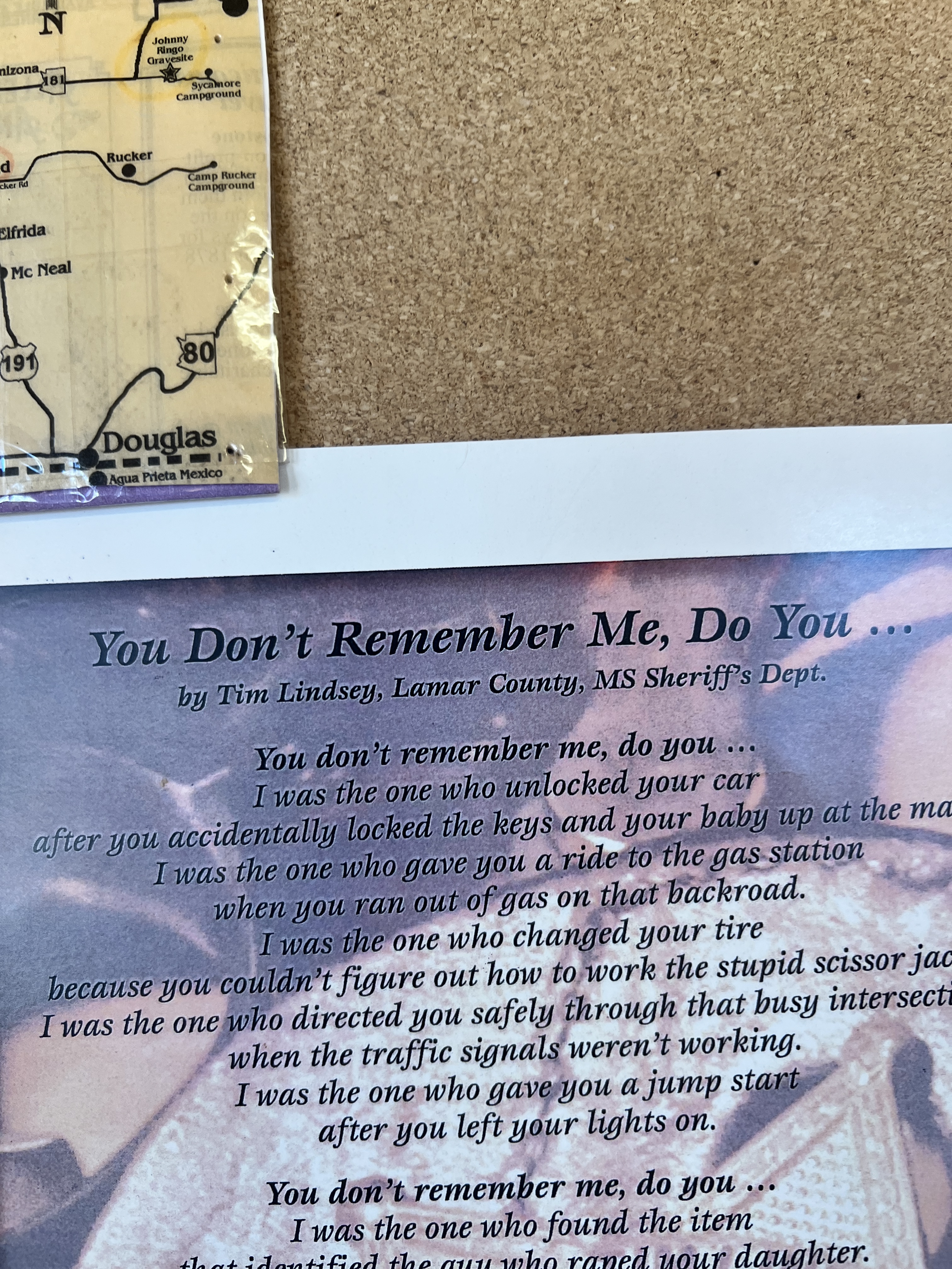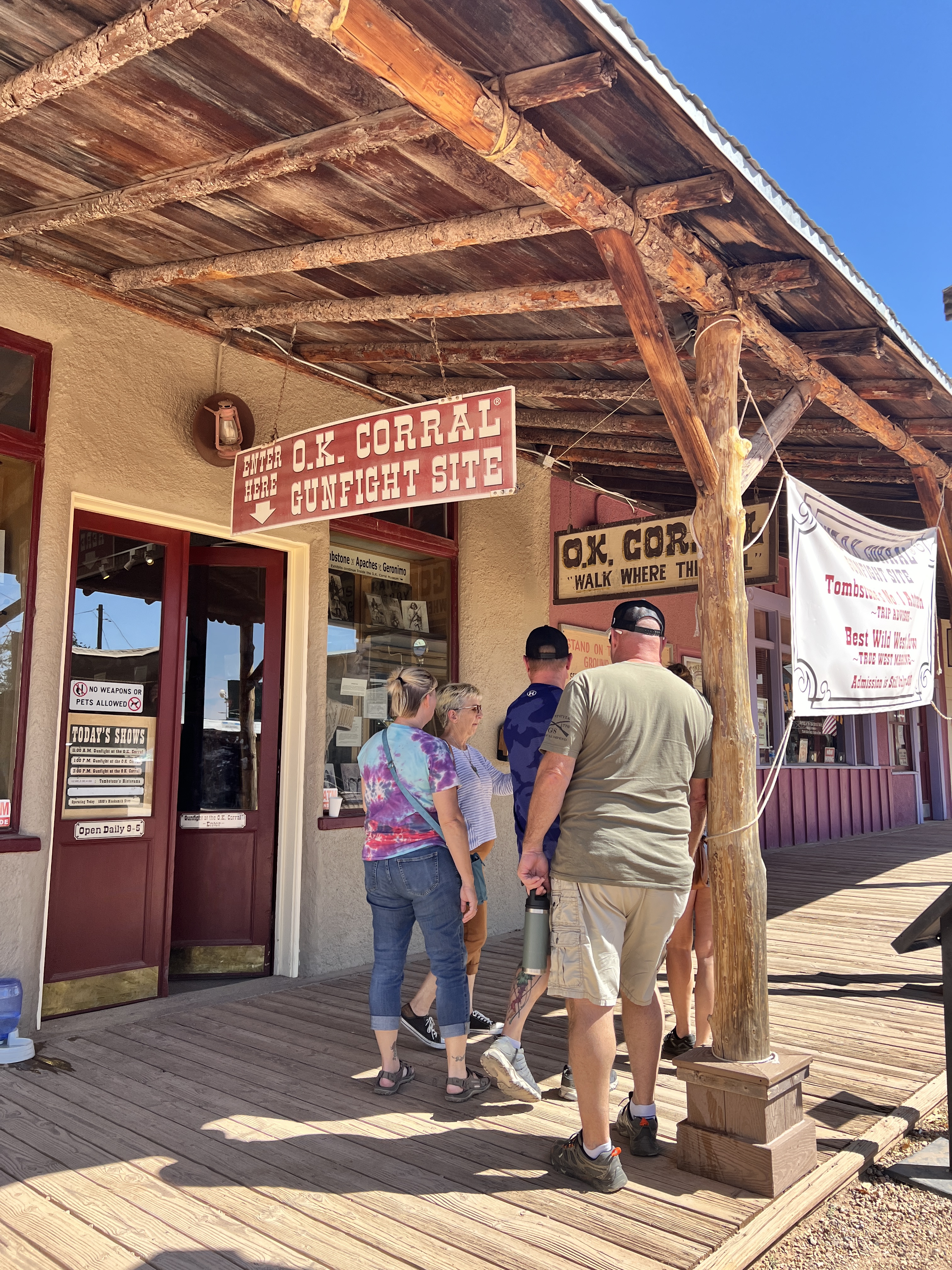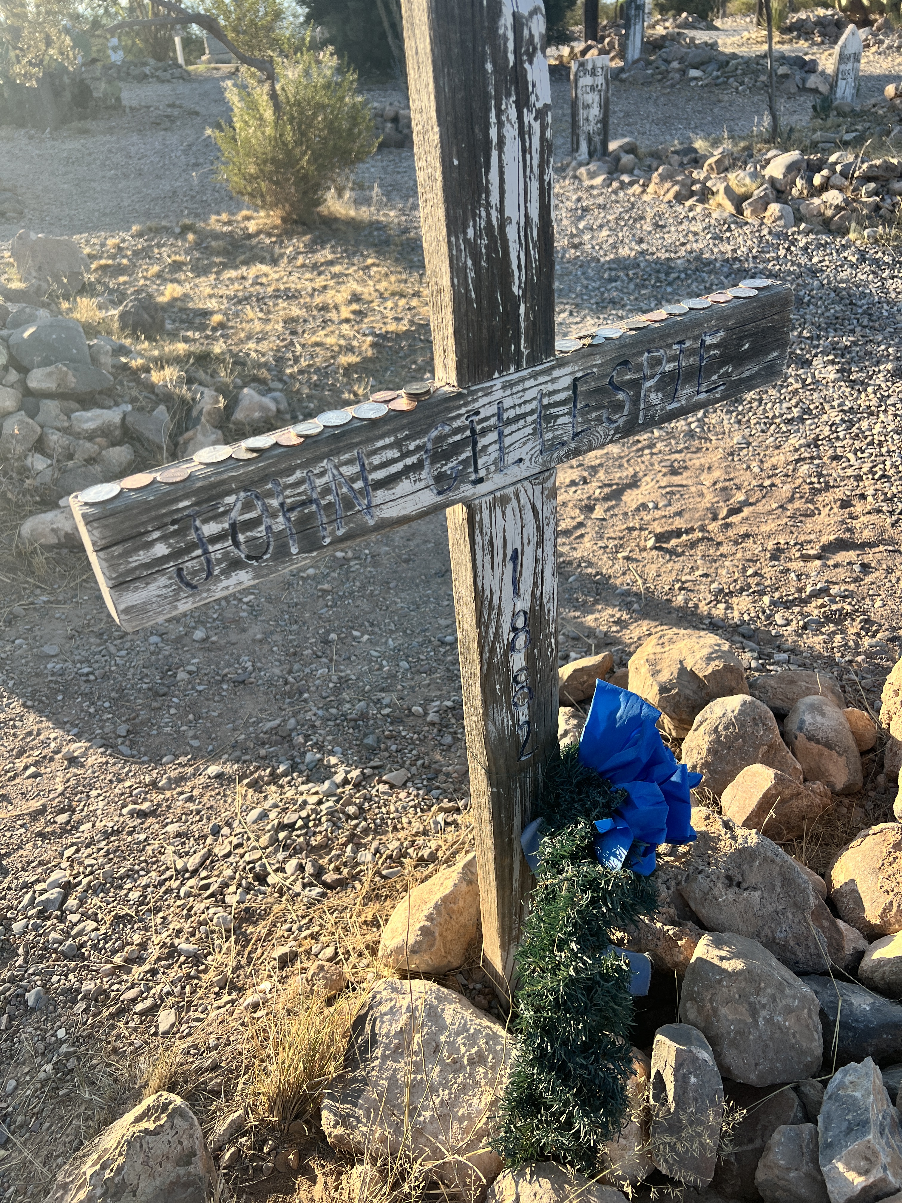 The 2nd day consisted of a trip to the Historic Townsite of Fairbank on the road to Tombstone. Fairbank was a small mining community until the ranchers ran everyone out of town (based on my recollection from a prior visit). The buildings are still intact although not safe to enter but there is a visitor center that is staffed by volunteers. Teri and I thrill with the history of these types of locations. Next stop was Tombstone where we walked the dusty streets and boardwalks and dreamed of hearing the jingle of spurs and the clomping of horses hoofs. We did take a tour of the Birdcage Saloon and also jumped into a stagecoach for a riding tour around the town. Our last stop was Boothill. Little did I know that this was the actual town cemetery until it was closed and not just an attraction. There are 3 lawmen buried here and their graves are decorated with blue ribbons. At the entry there is a photo of an essay titled, You Don’t Remember Me, Do You written by Tim Lindsey, Lamar County, MS Sheriff’s Dept. I’ll try to post the photo here but there was some glare. I found a link for this poem on a couple of websites memorializing fallen officers so I’ll paste it here. My apologies for making this a long read but this pulls at my heart and brings tears to my eyes.