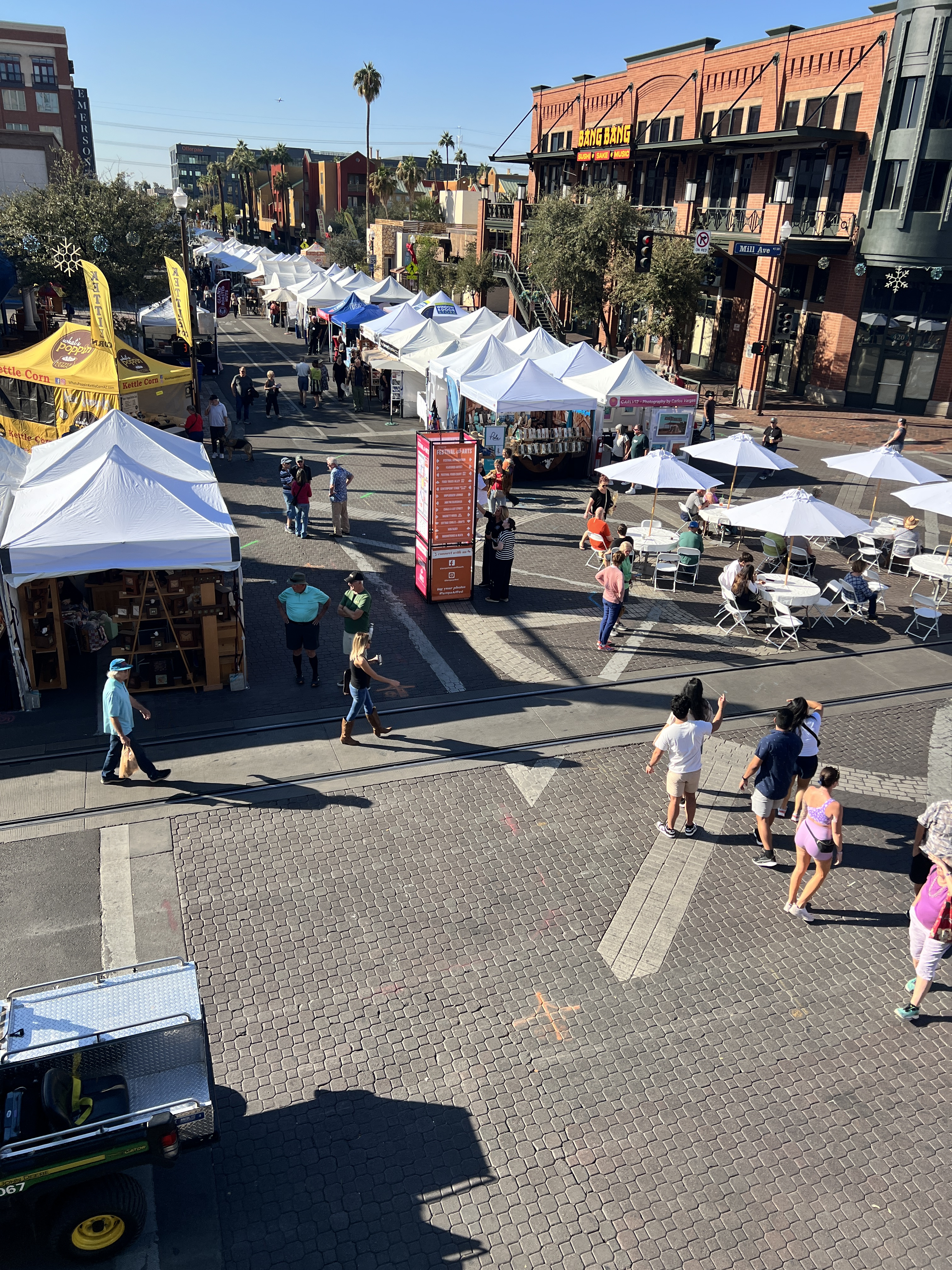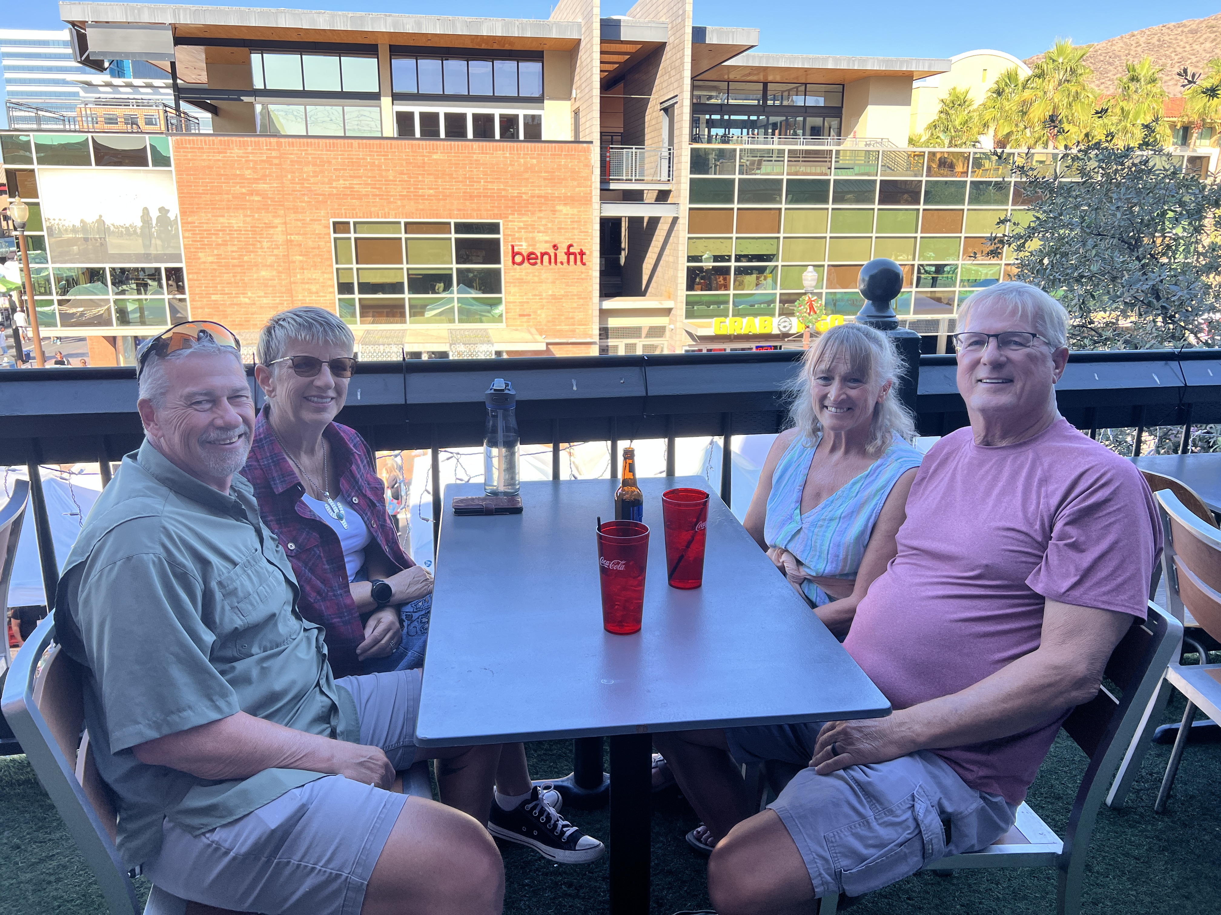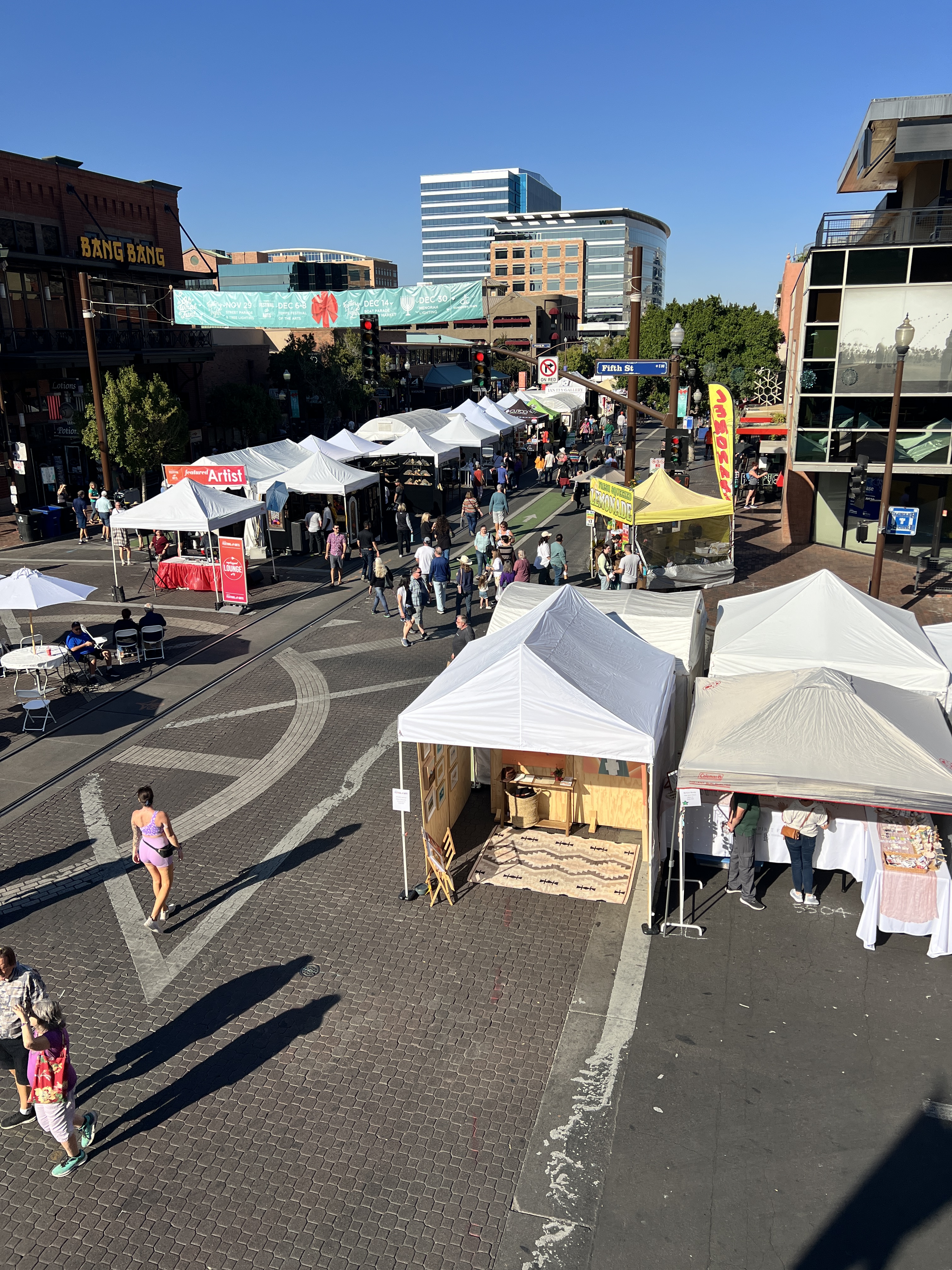 As the Thanksgiving weekend rolled to a close, it was time to dig out the Christmas decorations. This year we decided to decorate a real tree but we left it outside to save us the clutter of fallen needles. Besides, we have no idea where we would have put it in the motorhome without it being in the way. Football season was winding down with everyone looking towards the playoffs and more trash talking. Craig, Sheri, Teri and I took a day and rode the Light Rail into Tempe to walk through the Tempe Arts Festival. There is so much there, it’s hard to know if you saw everything before you were tired. We had a wonderful lunch on an upstairs balcony overlooking the festival.