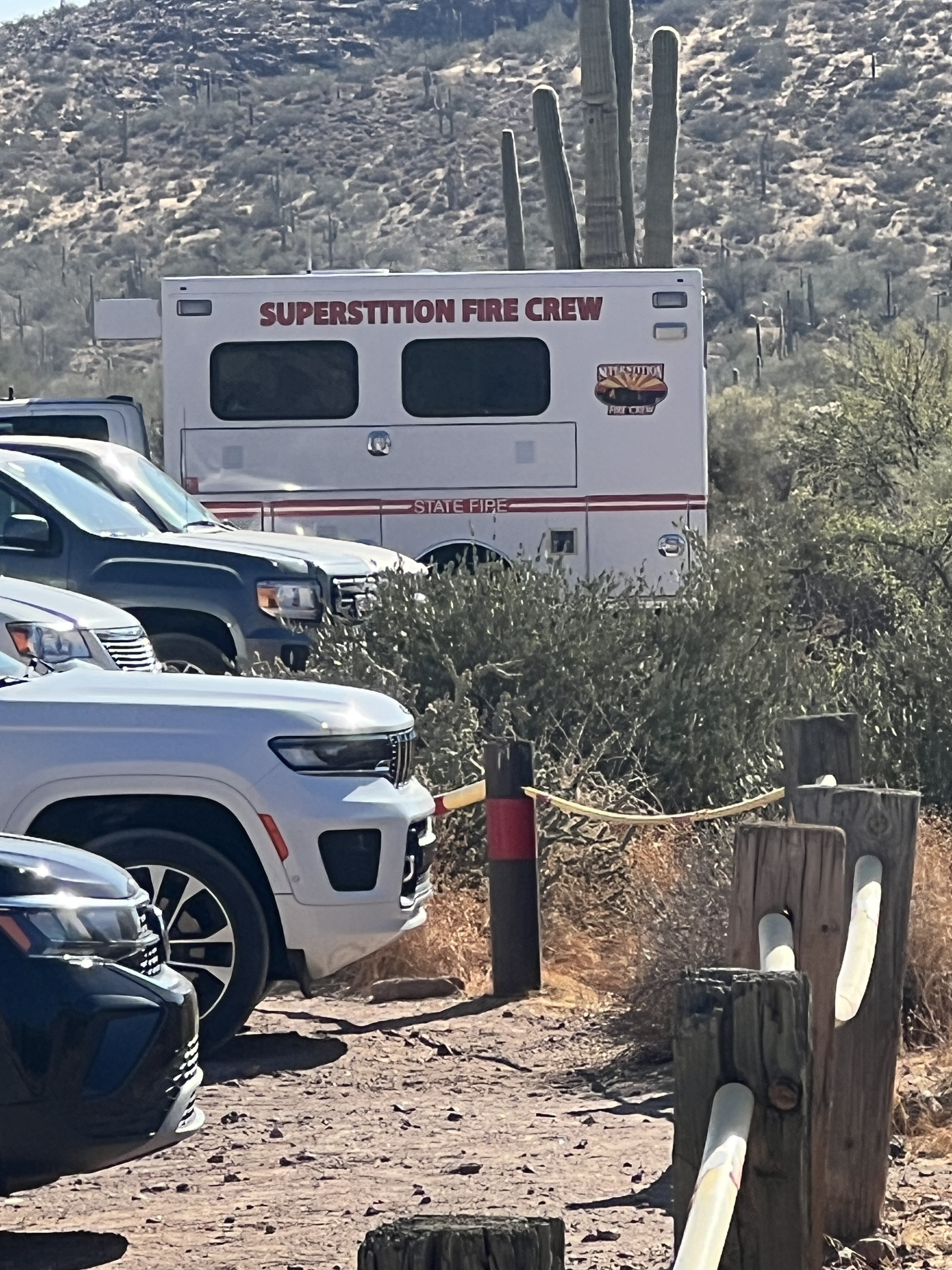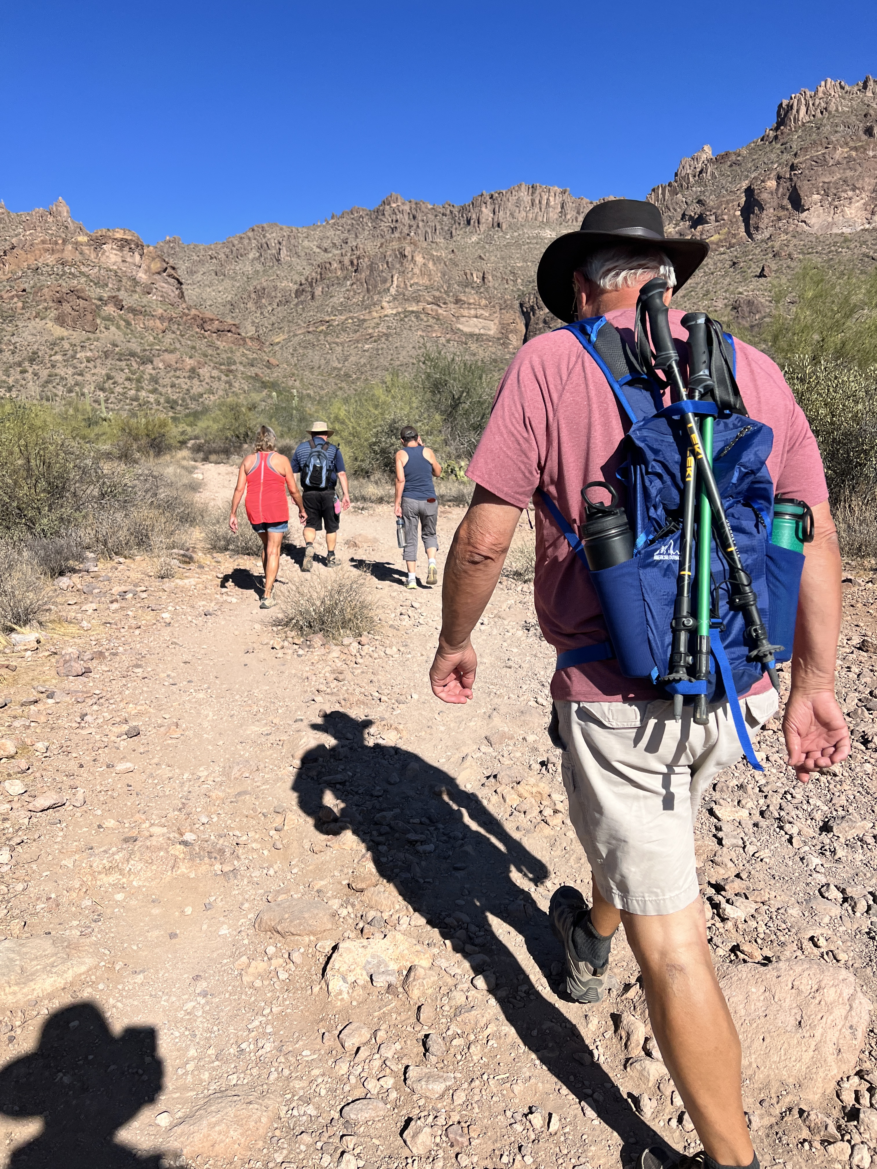 On one of our hikes into the foothills of the Superstition Mountains, with our crazy crew, we came across a crew of AZ State Fire Dept Hotshots. This team of about 20 were out on a training hike. We were all dressed for the heat that was present. They were all dressed in fire fighting gear. They were wearing yellow long sleeved, heavy fabric shirts, green heavy duty cargo pants, black high heeled boots and all were carrying a backpack and the tools of their trade which included shovels, picks, chainsaws. We spoke briefly as we thanked them for their service and wished them well. As mentioned this had been a tough year for wildland fires.