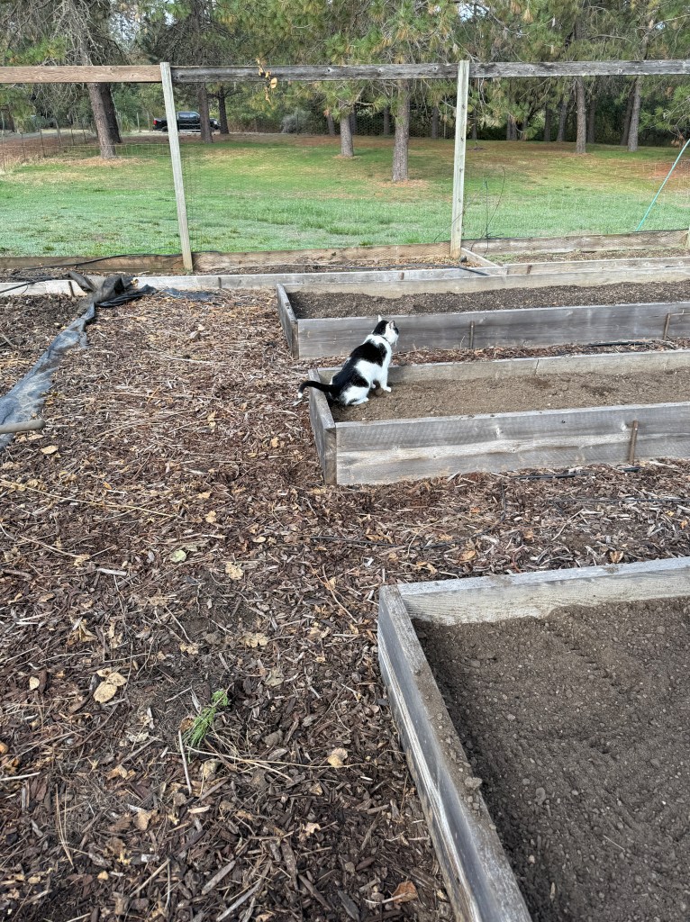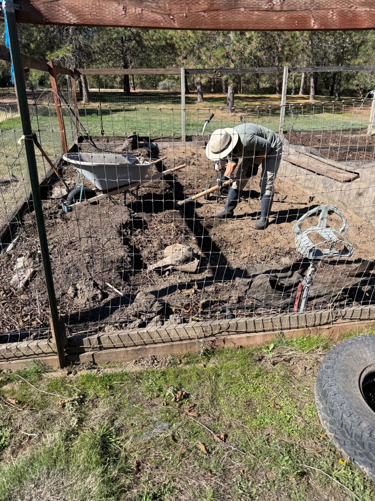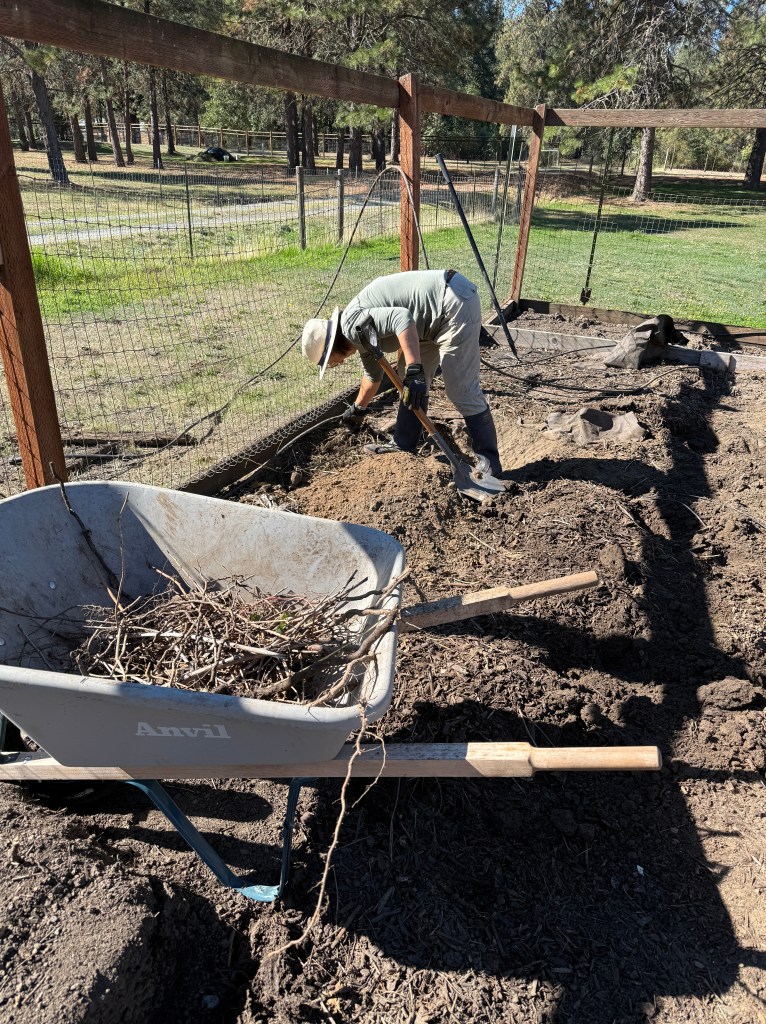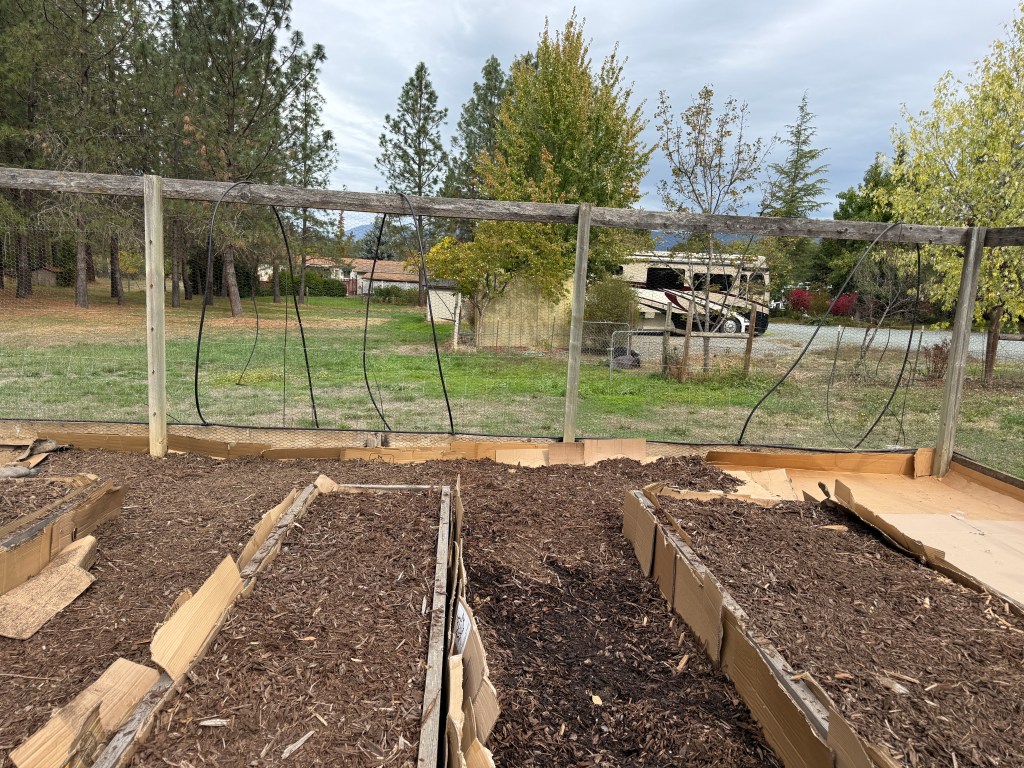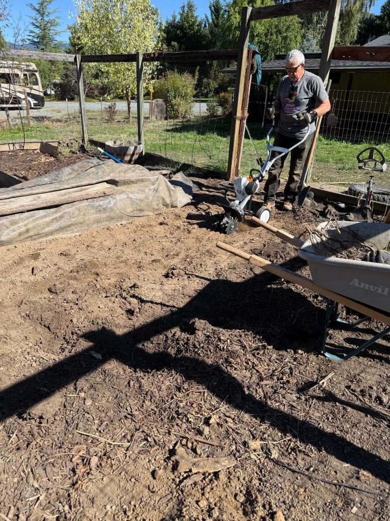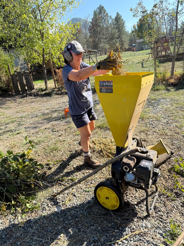 Back at home we continued to work on the garden. The garden is an area about 30 ft by 30 ft, fenced to keep the deer out which had been overtaken by blackberry bushes. If you’re not familiar with blackberry bushes, they are highly invasive . Our goal was to clear them from the garden so that Teri could start planting vegetables at the appropriate time. So we cut the bushes and hauled them to our burn pile. We also discovered that these bushes send out runner roots (volunteers) that invade the area. Teri spent a lot of time with a pick and shovel pulling these roots. Her goal was to have the garden clear of the roots, as much as possible, lay down a layer of cardboard as a weed block and cover that with either dirt or bark chips. We had been buying bark at the store, but it is expensive. So we started making our own bark. We bought a chipper and started chipping the yard debris that we collected. Not the blackberry! We put any invasive plant matter in the burn pile. We don’t want those sprouting in our bark!