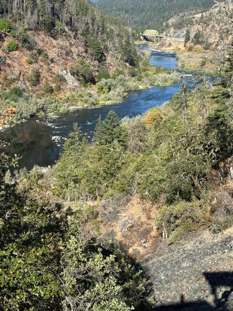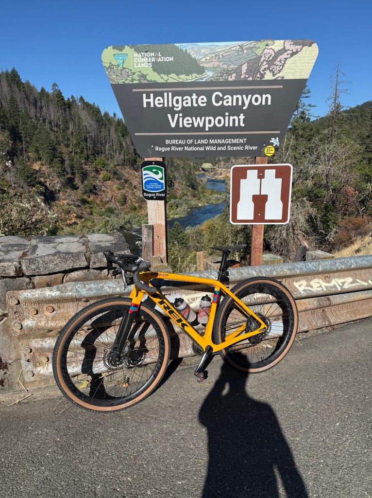 I have met a group of folks I have dubbed the Rogue River Riders. This is a group of about 6 people who bicycle ride 3 days a week. I try to join when my training schedule allows. Each ride is determined the morning of the ride. One of the rides took us to the Hellgate Canyon Overlook. The view from this overlook is amazing. As you look up river into the canyon you see steep rock walls that appear to be just 100ish feet wide in the narrow sections and the river is easily 100 feet below us. The Hellgate Canyon has been used in several movies to include The River Wild (Merryl Streep, Kevin Bacon) and some John Wayne movies. We learned of this on our jet boat cruise in August 2024 which we wrote about in that blog.
