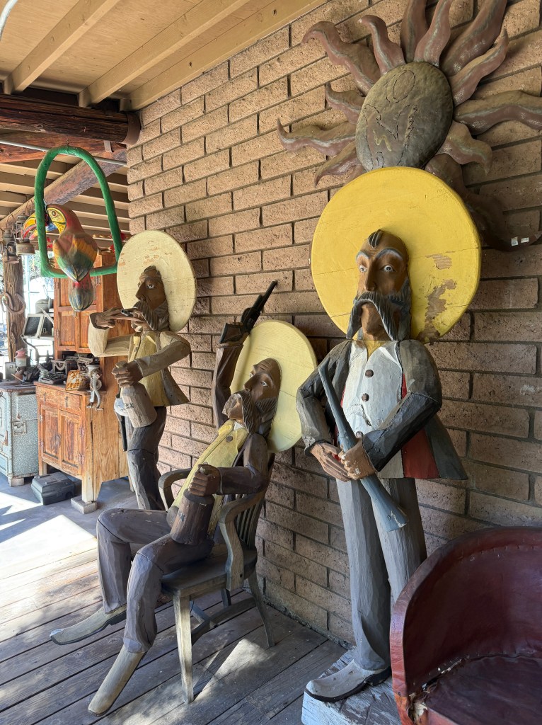 The next morning was sunshine with a bit of wind but not like the night before. As I motored through Goldfield, NV DOT was still trying to put a semi-trailer back on it’s wheels from the night before. Today’s drive was uneventful and we stopped for the night in an Escapees Park in Pahrump, NV which is about 30 minutes northwest of Las Vegas. The next day we stopped off at Teri’s favorite stop, Luchia’s, in Wikieup, AZ for lunch and pie and to walk through the back yard where we could watch the peacocks and Koi. We arrived in Apache Junction on the 27th of October where we were met by many of our friends from the last year.