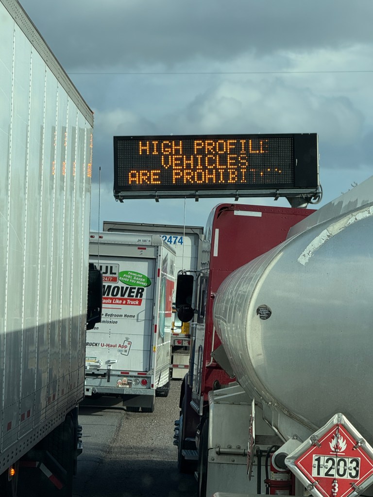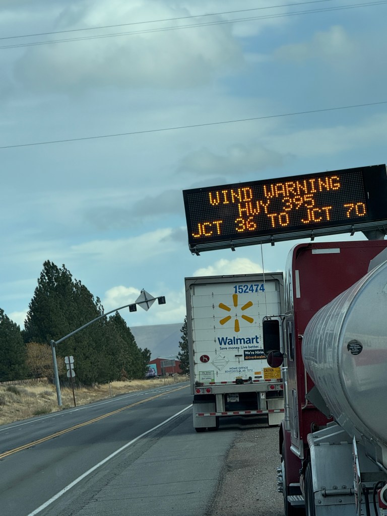 Our first night stop was going to be in Fernley, NV which is about 20 minutes east of Reno. To get there I left the I-5 at Mt Shasta and continued on rolling along the CA-99. As I got down off the mountains the rain had stopped but it had become a bit windy. Teri was about 30 minutes ahead of me. As she drove south out of Susanville, CA on US-395 she called and said the cross winds were getting pretty bad and CA Highway Patrol (CHIPS) was out in force. I rolled through Susanville and approached a 4 way intersection. A CA DOT worker was at the intersection with his emergency lights flashing. The signboard across the road said “Wind Warning- High Profile Vehicles Are Prohibited”. At the intersection the polite DOT worker said the road was closed due to high winds. I asked how long it would be and he shrugged and said it could be 10 minutes or it could be all night. It was currently 2pm-ish. I asked if there was a way around it and he said I could backtrack about 2 hours or I could just pull over to the side of the road along with an 18 wheeler and wait it out. He said when he drove by honking his horn, it would be safe to continue. I pulled to the side of the road and hoped it wouldn’t be too long. For the next 4 hours, I dozed, snacked and listened to my audio book and talked to Teri on the phone. Finally at 6pm-ish the DOT truck went up and down the road 4 times honking his horn and flashing his lights. I pulled out on the dark highway with about 10 other trucks. During the stop Teri and I talked and we decided she should get a motel in Reno and not wait for me. I finally made it to Fernley about 9pm and promptly went to bed after setting up the motorhome.