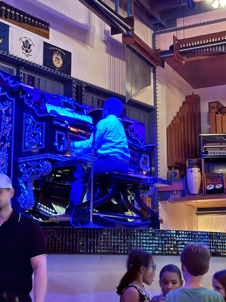 Another night a group of us headed over to Organ Stop Pizza. Teri and I had never been there. It is was quite a delight. Not only did we enjoy the pizza but we were able to enjoy the music played by the organist who was accompanied by horns, drums, bells, and cymbals that were all electronically controlled by him while he played on his black and white keys. It was an electronic marvel!