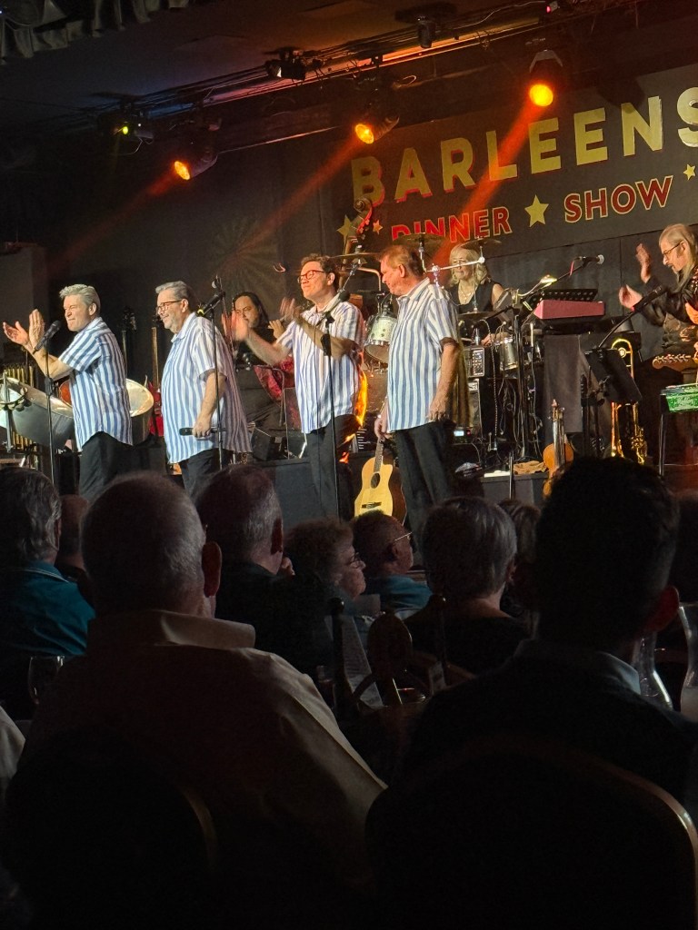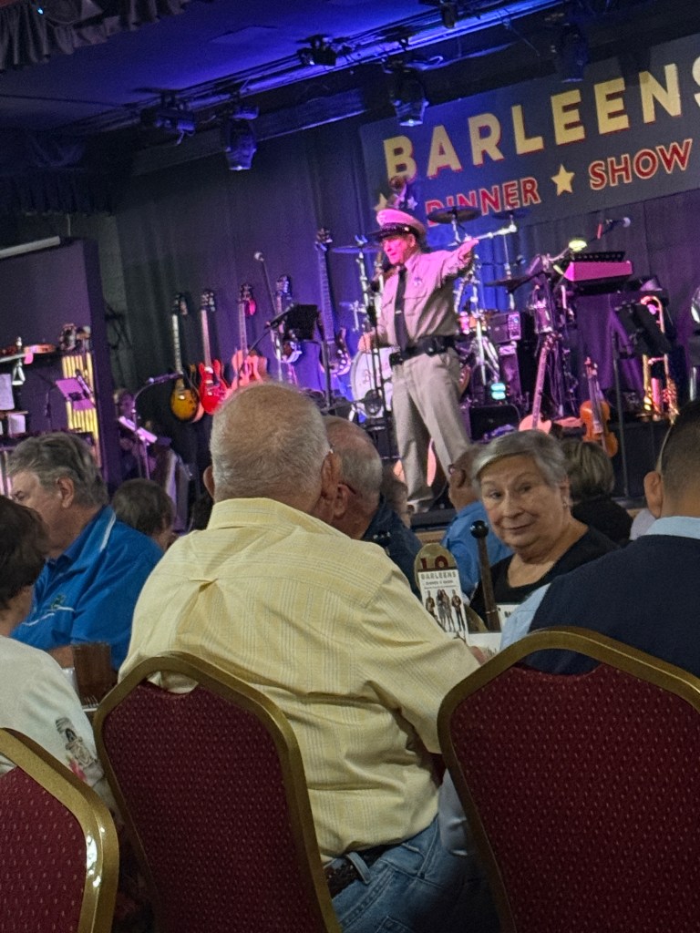 Craig, Sherie, Teri and I spent an afternoon walking through downtown Fountain Hills at the Craft Show. Many of the artists are quite imaginative and produce some amazing crafts. We also had the enjoyment of seeing the fountain blast the water high in the air. Afterwards we stopped to have lunch at a very nice steakhouse in FH. Later that afternoon after getting home and cleaned up, Teri suggested we go and visit with Craig and Sherie at their RV. This is a routine ritual of ours so I said ‘sure’ and we walked over. As we sat around on the patio, Craig asked if we would join them for dinner. We agreed. Craig said they could drive and we all piled into their pickup. Craig asked if he could pick the spot and I said “You’re driving”. Little did I know they all had something up their collective sleeve. We exited the park out onto the highway to lead into town. This is the not the normal way any of us go to town for dinner and then he made a U-turn and I figured he was going back the way we normally head into town. But then he turned into the parking lot of Barleen’s Dinner Theatre. He dropped us off at the front door and went to park the truck. As he returned and we walked to the front door I heard him give our reservation name and I heard the host say ‘party of 8’, but there were only 4 of us! As we got to our table, our tribe started singing Happy Birthday to me. They got me! We had a great evening. The entertainers were quite talented and full of humor. If you get a chance to visit, it is well worth your time. The theater is owned by the Barleen family and they are all entertainers.
